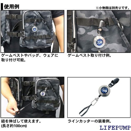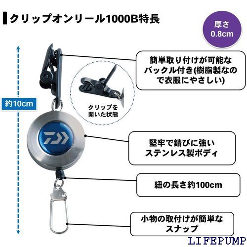DAIWA/ダイワクリップオンリール1000B◆重さ:約26g◆紐の長さ:約100cm●簡単取り付けが可能なバックル付き(樹脂製なので衣服にやさしい)●堅牢で錆びに強いステンレス製ボディー●ヒモは自由自在使用可能(ヒモの長さが約100cm)●小物の取付けが簡単なスナップ