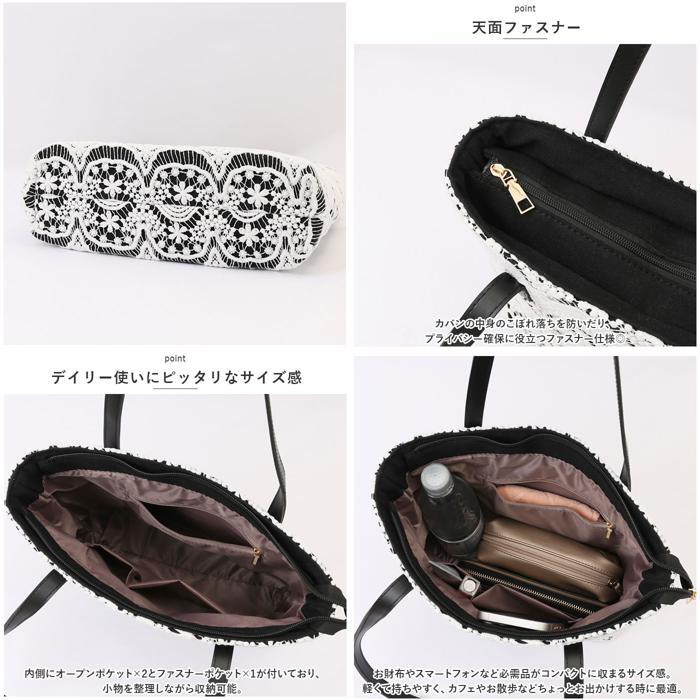 商品説明 | ・・華奢なレース素材を使ったトートバッグが発売♪ ・表面生地にはふんわり華やかに彩るレース生地を採用し、華やかでナチュラルめなデザインに。 ・【デイリー使いにピッタリなサイズ感】 ・お財布やスマートフォンなど必需品がコンパクトに収まるサイズ感。軽くて持ちやすく、カフェやお散歩などちょっとお出かけする時に最適。 ・内側にオープンポケット×2とファスナーポケット×1が付いており、小物を整理しながら収納可能。 ・【天面ファスナー】 ・カバンの中身のこぼれ落ちを防いだり、プライバシー確保に役立つファスナー仕様◎ ・【持ち手】 ・持ち手ハンドルには、汚れが目立ちにくく、丈夫なフェイクレザー素材を使用。 ・肩掛けもできるよう長めの設計。 ・異素材使いでカジュアル過ぎないデザインに。 ・【様々なコーデに合う】 ・レースのナチュラルな素材感で、時にはエレガントに、時にはガーリーに、ファッションに合わせて自在にコーディネート♪ |