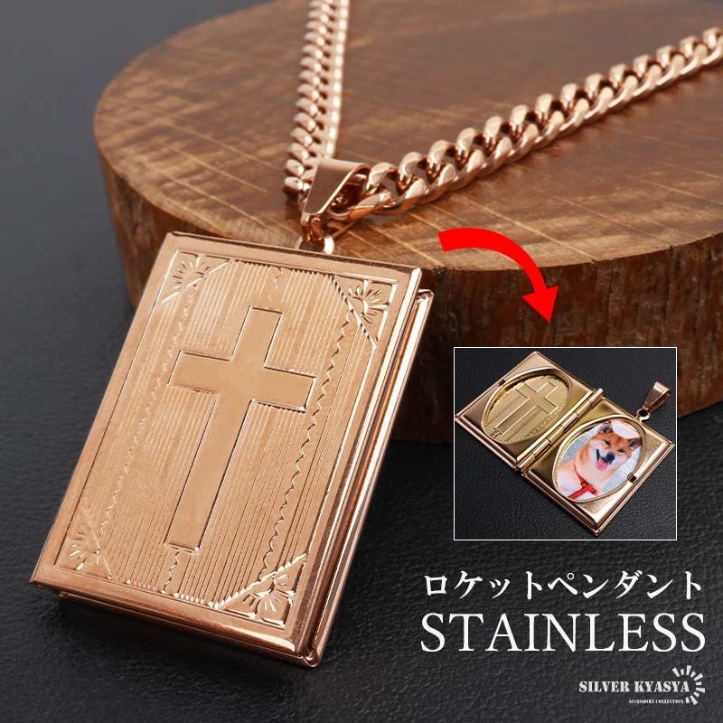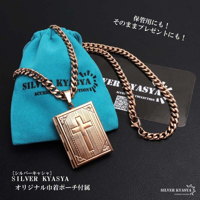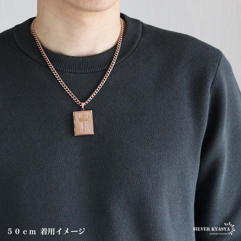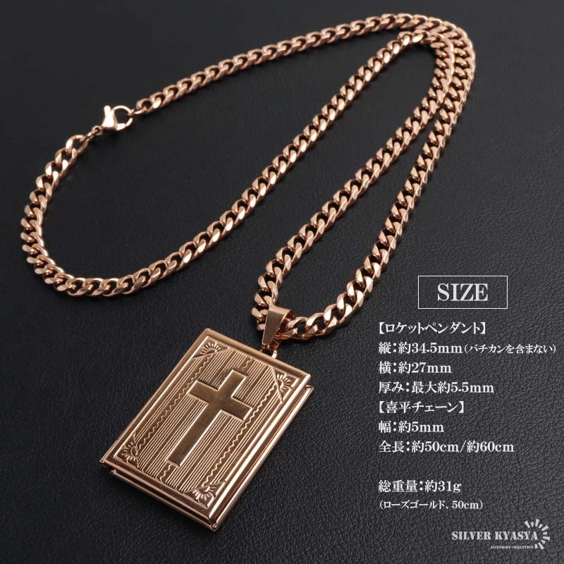 スクエアフォルムにクロスを刻んだトップのロケットペンダントネックレス。肌なじみの良いローズゴールドで統一。程よい輝きで、首元を飾るアイテムです。