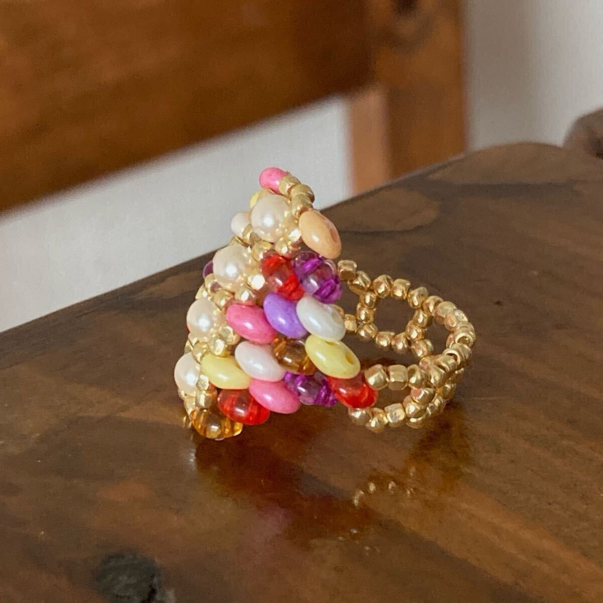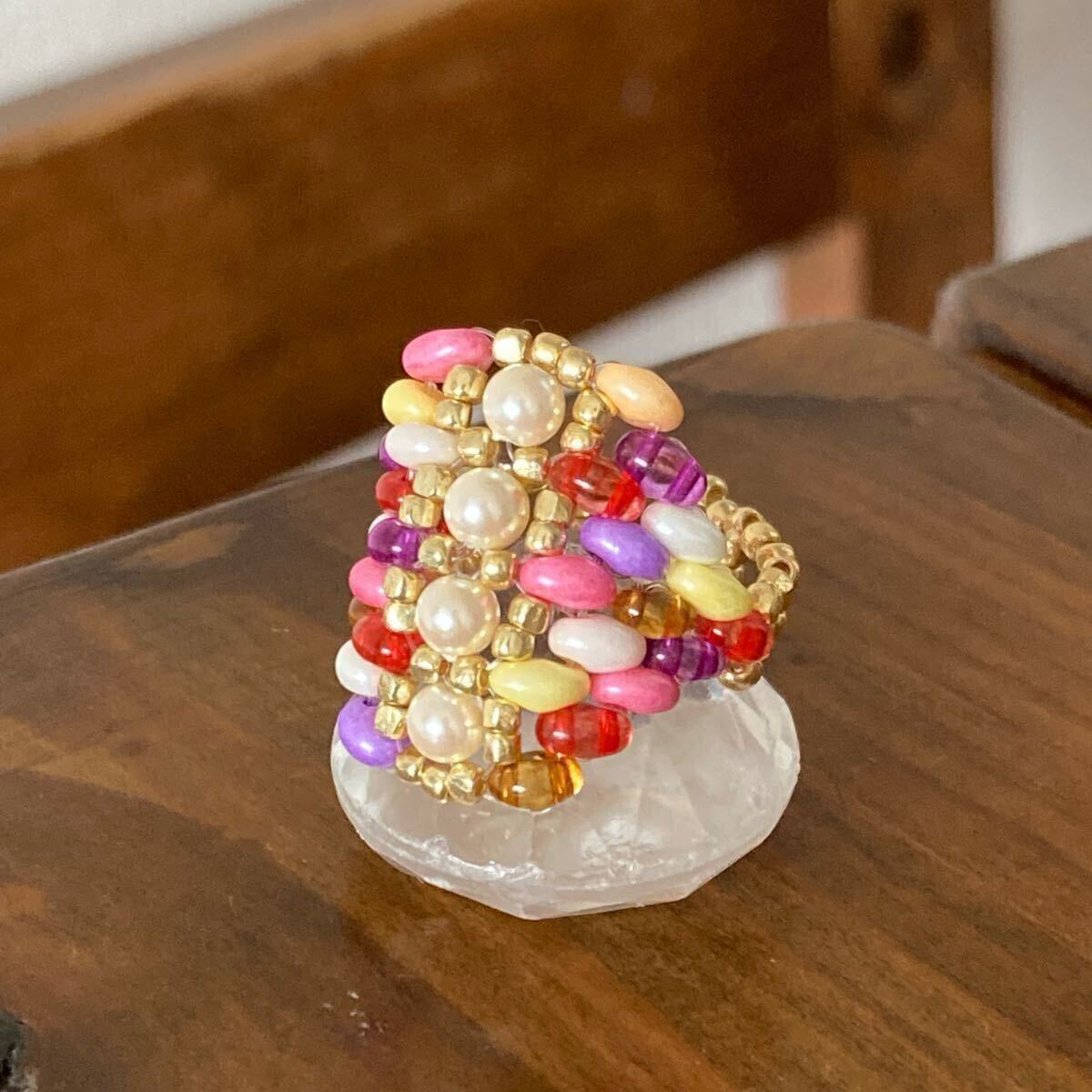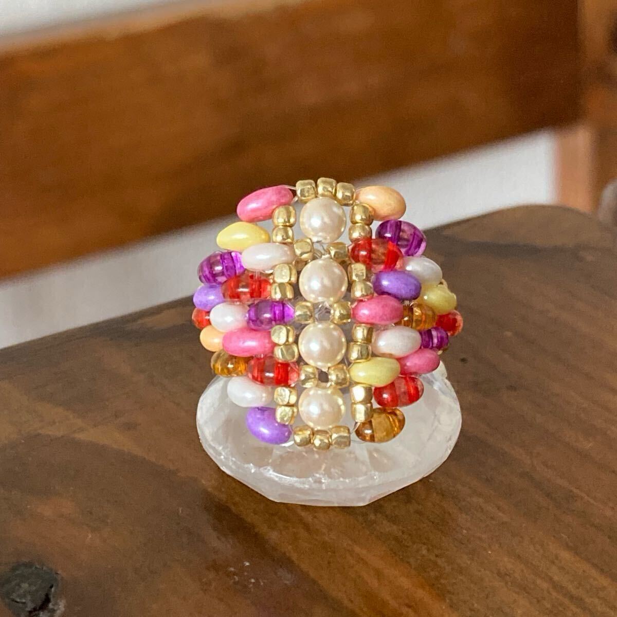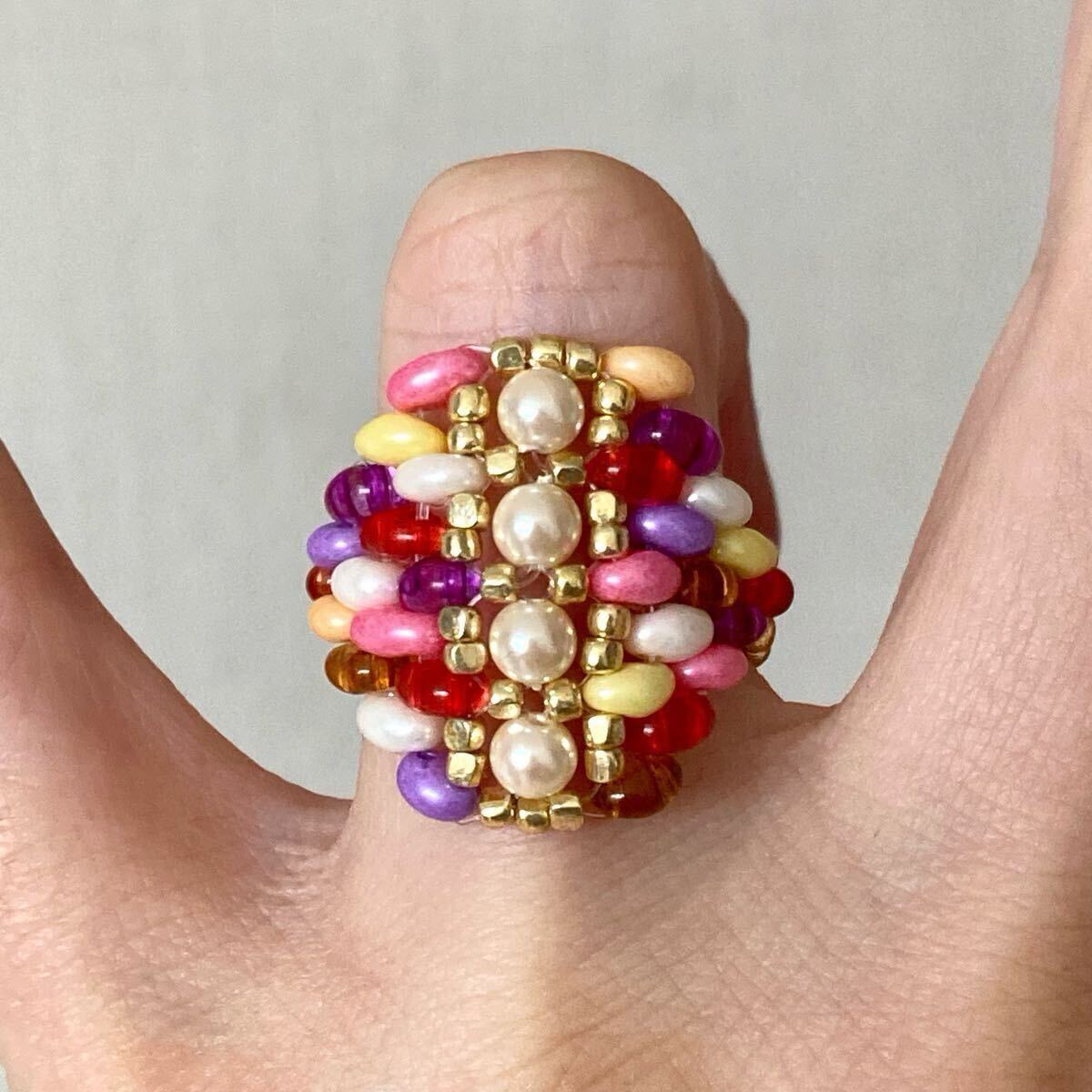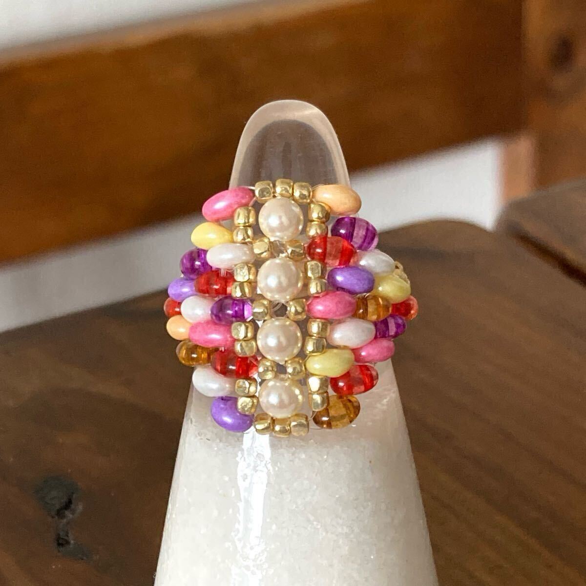 縦に並んだパールビーズとポップなカラーリングが可愛いリングです♪