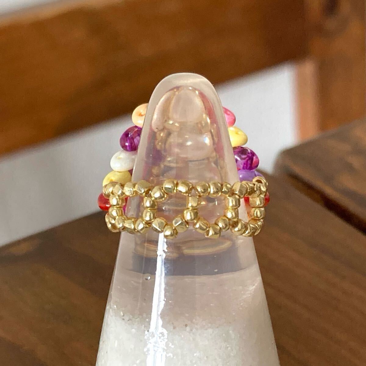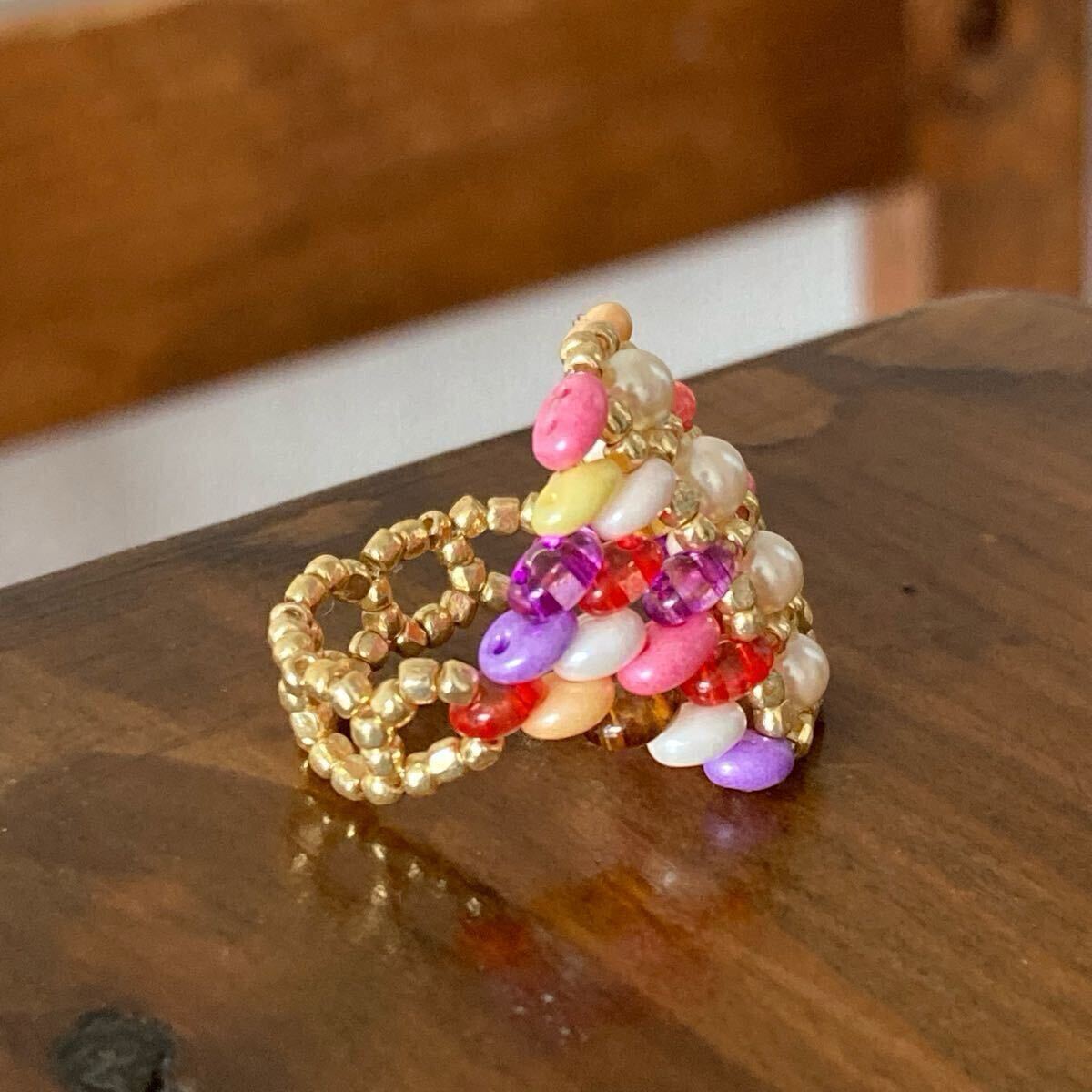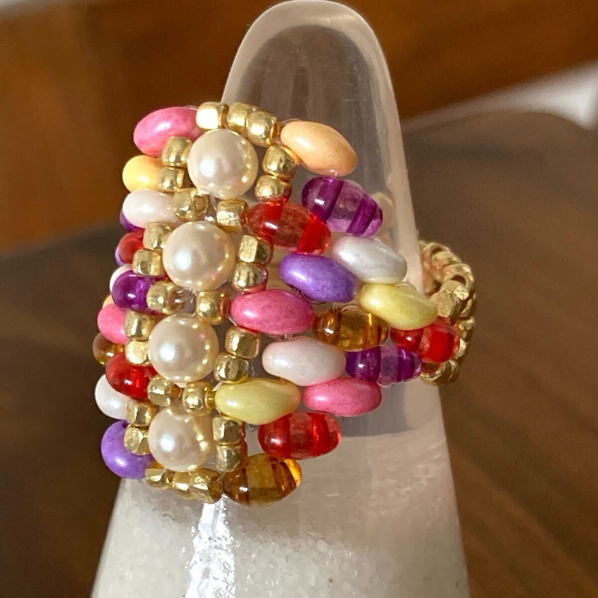 4mmの白のパールビーズ、赤、ピンク、パープル、白等のカラフルなツインビーズ、ゴールドのスリーカットビーズで作ったリングです。