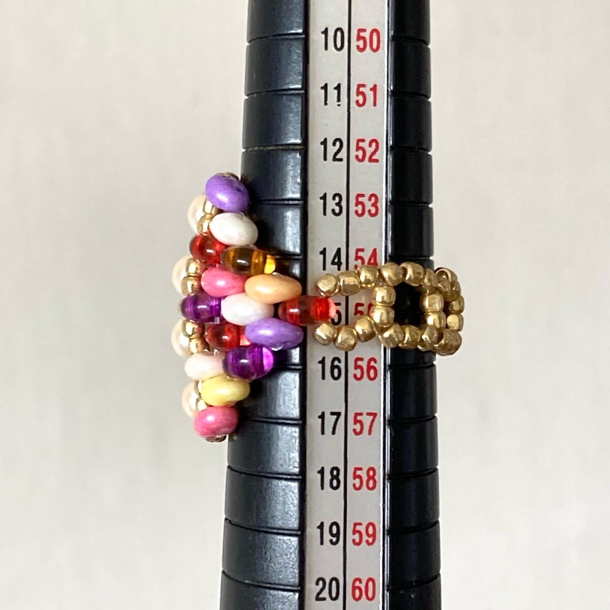 14-16号 ビーズ リング 指輪 ハンドメイド パールビーズとツインビーズのリング カラフル赤ピンク系 です。