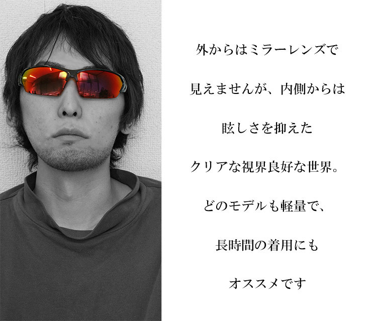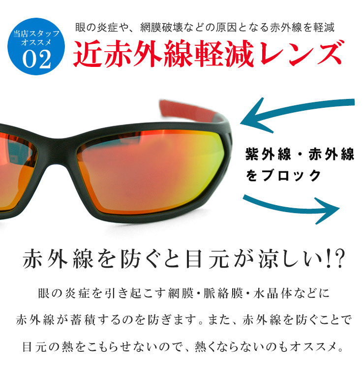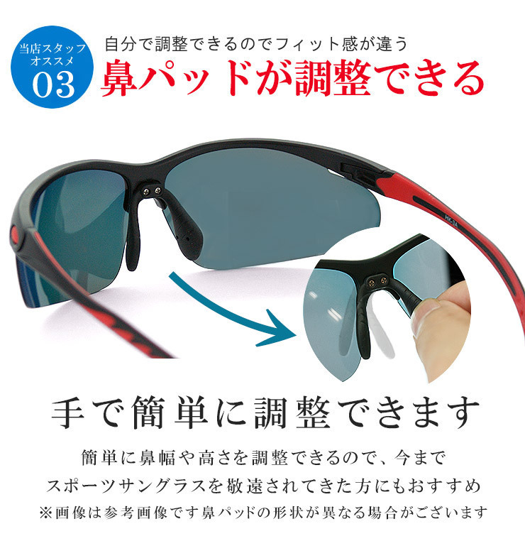 偏光レンズで日射しが強い日のギラつきを抑えます。 軽量感に優れ長時間の着用の疲れを軽減 汗をかいてもズレにくいノーズ&イヤーグリップ 太陽光に含まれる近赤外線を削減し、眼の炎症を防ぎます。 鼻パッドは手で自由に高さや幅が調整が可能。 紫外線ももちろん99%以上で大切な眼を紫外線から守ります。 |