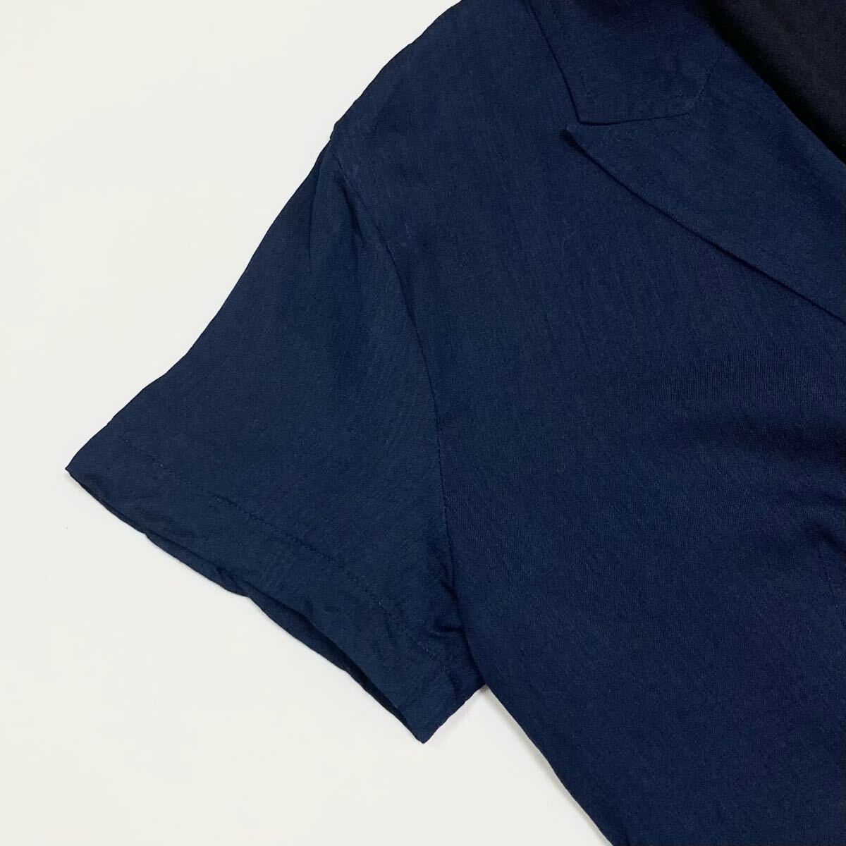 光沢感のあるキュプラデニムを使用したアシンメトリーシャツジャケット。