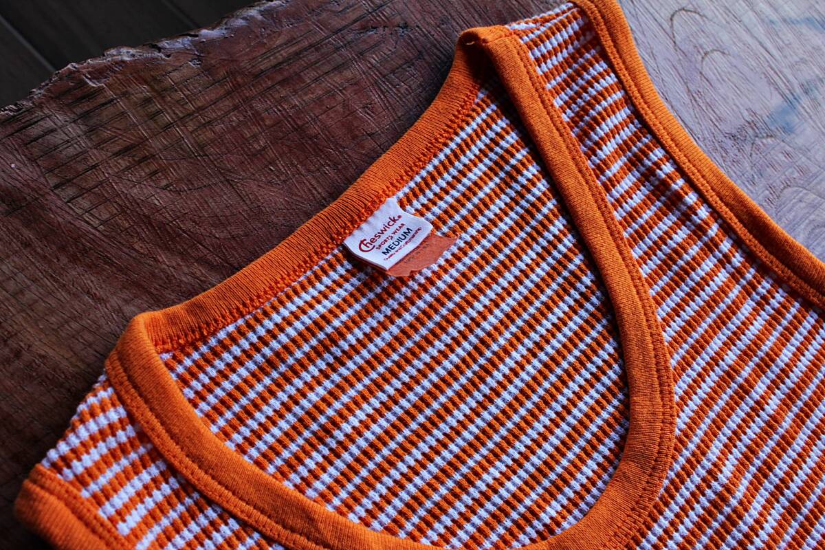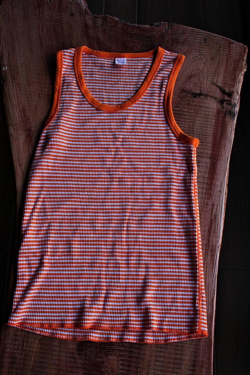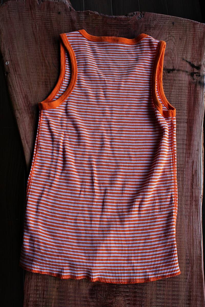[商品説明] | ★東洋エンタープラズのスポーツカジュアルブランド[Cheswick(チェスウィック)]のリブボーダータンクトップです。かなり高品質なお品です。 ★1990年代中頃のデッドストック。やや肉厚で丈夫なボディ。縦のリブで横へしっかり伸びて身体に寄りそいます。肌触りのいい綿100%。米国製。 ★カラーは、ホワイトにオレンジの細めのランダムボーダー。 サイズはM(約ですが着丈61、身幅36、肩の端から端まで30cmくらい。 ★当時定価2900円+税。希少なデッドストックですが、プラミアなどつけずにご提供いたします。雰囲気あります。 |