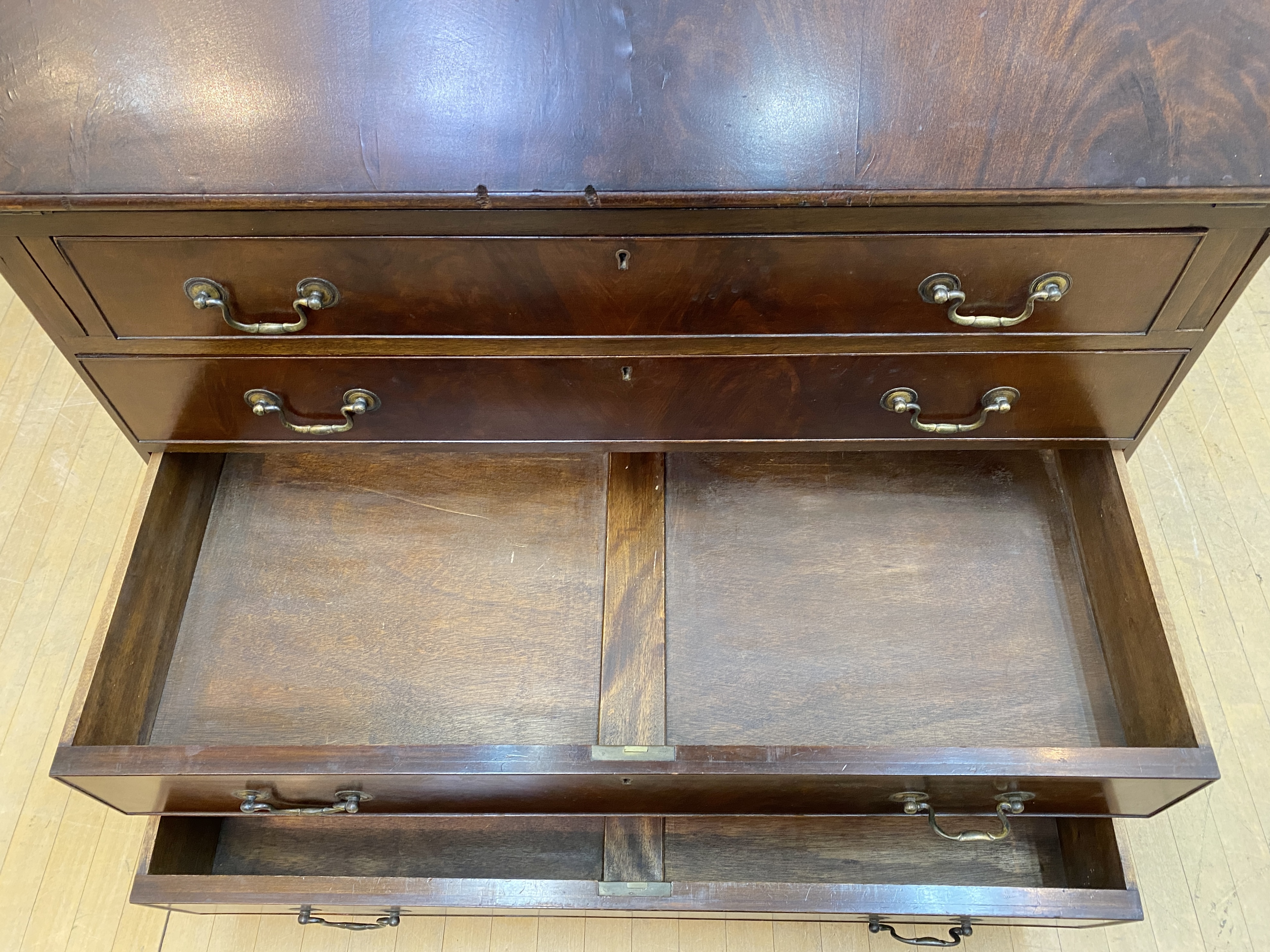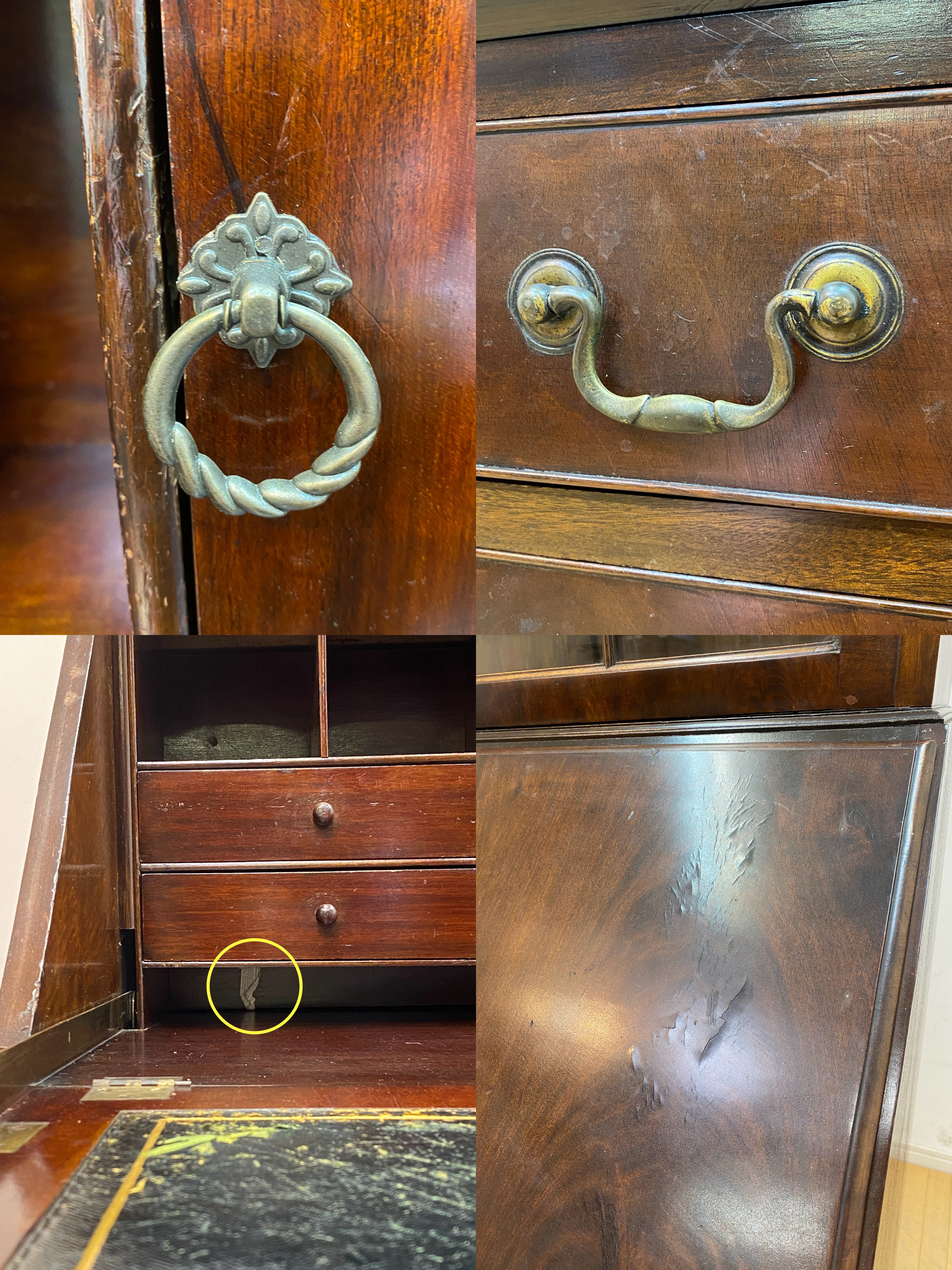こちらは英国アンティークのライティングビューローです。 中古品です。 イギリスより、アンティークのライティングビューローのご紹介です。 1900年前後に作られたと思われる、ヴィクトリアン期の少し飴色がかった色合いが魅力のアンティーク家具です。 ジョージアン中期(1727~60年)に流行ったデザインが用いられ、脚元はブラケットフィート(ブラケットフット)です。 ブラケットフィートの中でも緩やかなS字のカーブを描く女性らしいデザインで、どの角度から見ても上品な印象です。 格子状のガラス扉や屋根のデザイン等、アンティークらしい魅力を感じます。 ライティングビューローの上にブックケースが乗っていて、本棚として使うことができます。 扉を開けるとデスク部分が革張りになっているため、使い心地も良さそうです。 デスク奥は仕切り棚や小さな引き出しが付いていて、文具の収納にも便利です。 こちらは上下分割しはめ込み式で、2箇所の木ねじで固定されています。残念ながら鍵は欠品していますが、 どちらも手で開閉可能です。上段にはマグネットが後付けされているため、開いてしまうことはありません。 棚板は可動しますが、板のある部分でお使いいただくのが良さそうです。 ご自宅のインテリアだけでなく、店舗用の什器家具としてもおすすめのお品です。 【コンディションについて】 古いお品のため、キズや塗装落ちなど経年を感じます。ガラスには細かなキズが見られます。 デスクの奥には取りきれなかったシールが残っていますのでご了承ください。 ご使用の際は気にならないかと思います。キズなどありますが、現代の家具では味わえない細やかな仕様や 高級感を感じられるとても魅力的な家具となっています。 ご納品の際は上下分割してのご納品となります。組み立ての際、上下連結は木ネジでの固定となりますので、 多少穴埋めしてからネジ止めして頂くのをおすすめします。 他詳細については下記画像も併せてご参照ください。 ![]() ![]() ![]() ![]() ![]() お手入れしながら、一生を通して愛用していただけるお品です。 この機会に是非ご検討ください。皆様のご入札お待ちしております。 再良市場の他のお品物はこちらから!
