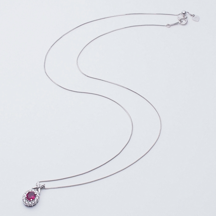 ルビーとダイヤモンドがセッティングされた18金ホワイトゴールド製のネックレスです。チェーンはスライドアジャスター付きでお好みの長さに調節可能です。