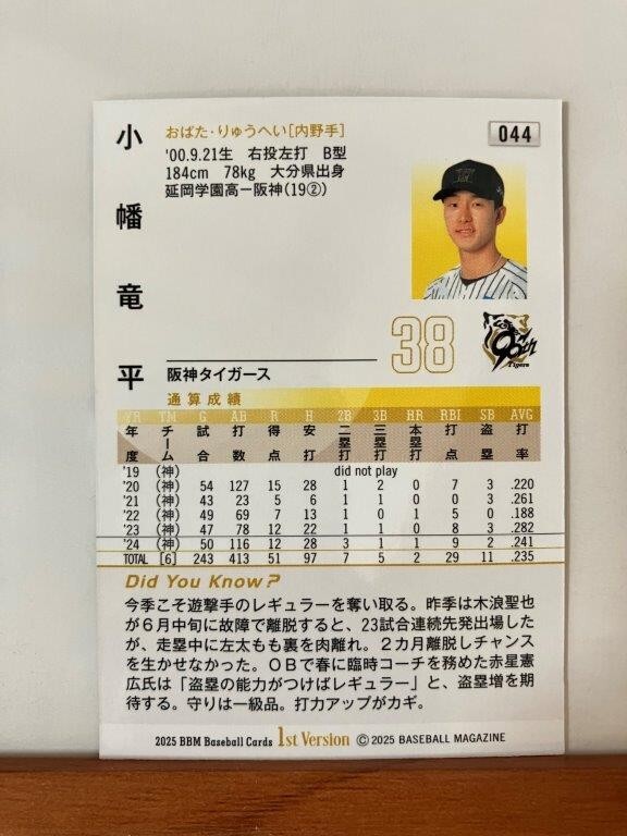 【2025 BBM 1st】044小幡竜平(阪神タイガース)レギュラーカード