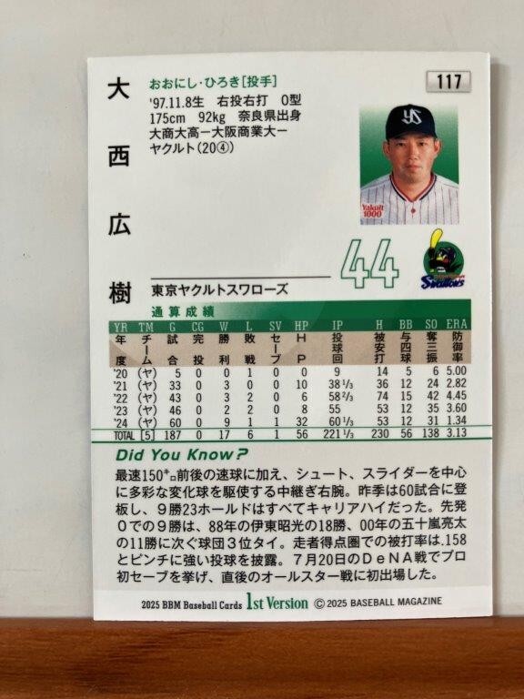 【2025 BBM 1st】117大西広樹(東京ヤクルトスワローズ)レギュラーカード