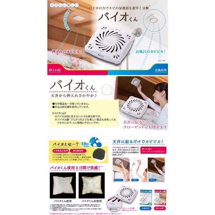 押入れ用「防カビバイオくん」は、目に見えない小さな微生物です。カビや悪臭・汚れを食べてそれを体内で消化分解し、無機物に変える特性を持っています。バイオくんは、人畜無害です。酸・アルカリのような激しい薬品も含有していないので施設及び器具などを侵しません。天井にはりつけるだけ。さらにバイオが500億匹に繁殖し、酵素でコーティングしてくれる。洗剤や拭き掃除も不要。パワーは1個で約6カ月程度持続します。