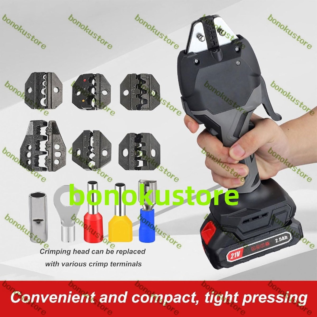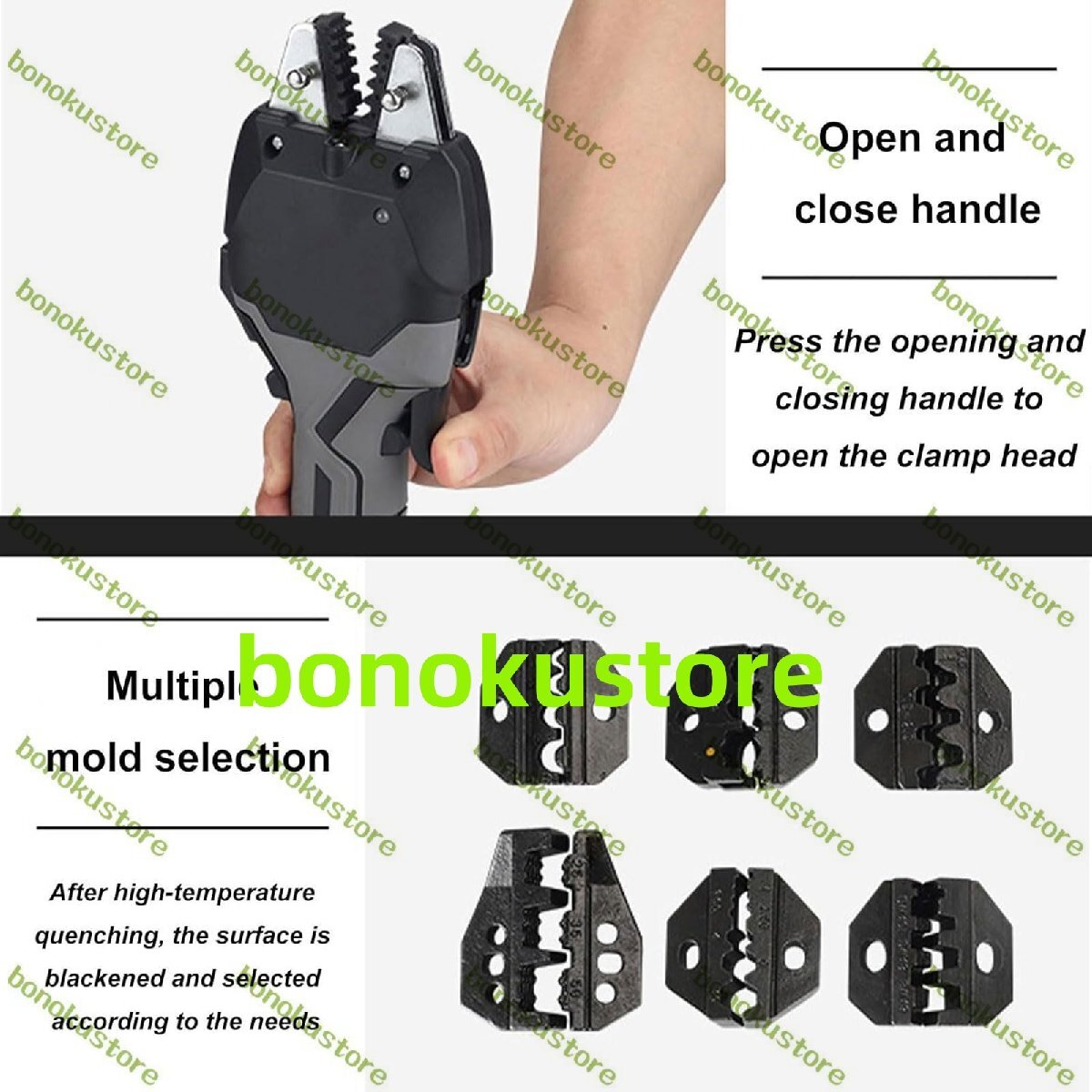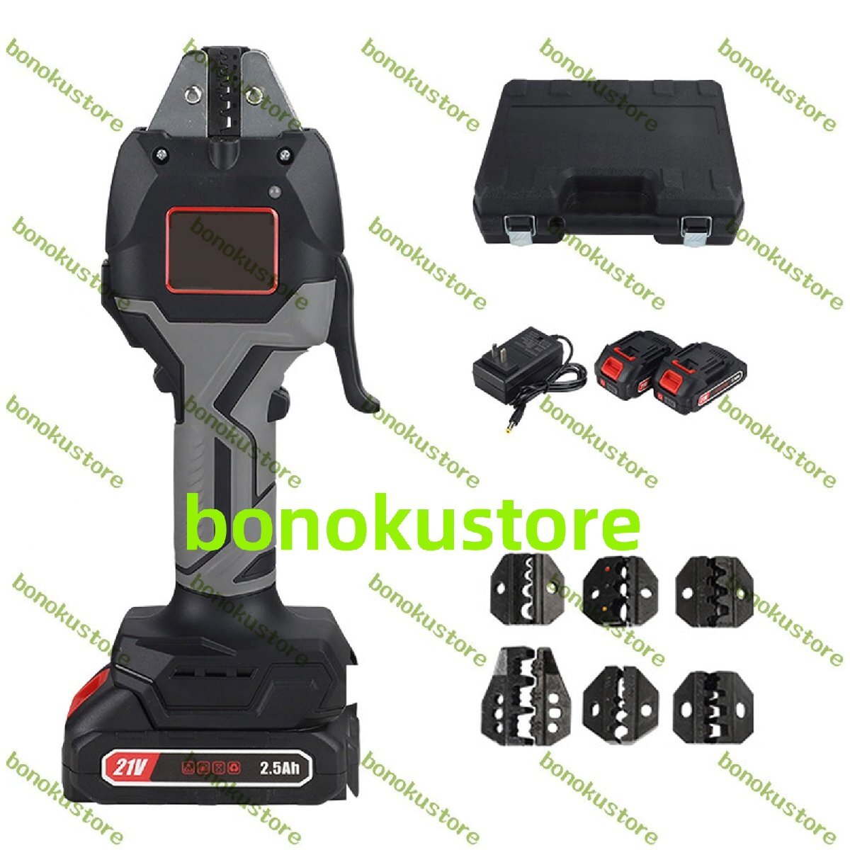 名称:電動圧着ペンチ 材質:合金鋼とプラスチック 圧着力:最大16KN バッテリー電圧:21V、2.5Ah 周囲温度: -10°C~+40°C 商品サイズ:30×11×7cm 梱包サイズ:34×31×10cm パッケージ内容: 電動圧着ペンチ×1 6×型 充電器×1 電池2個 収納ボックス×1