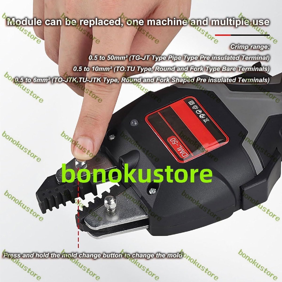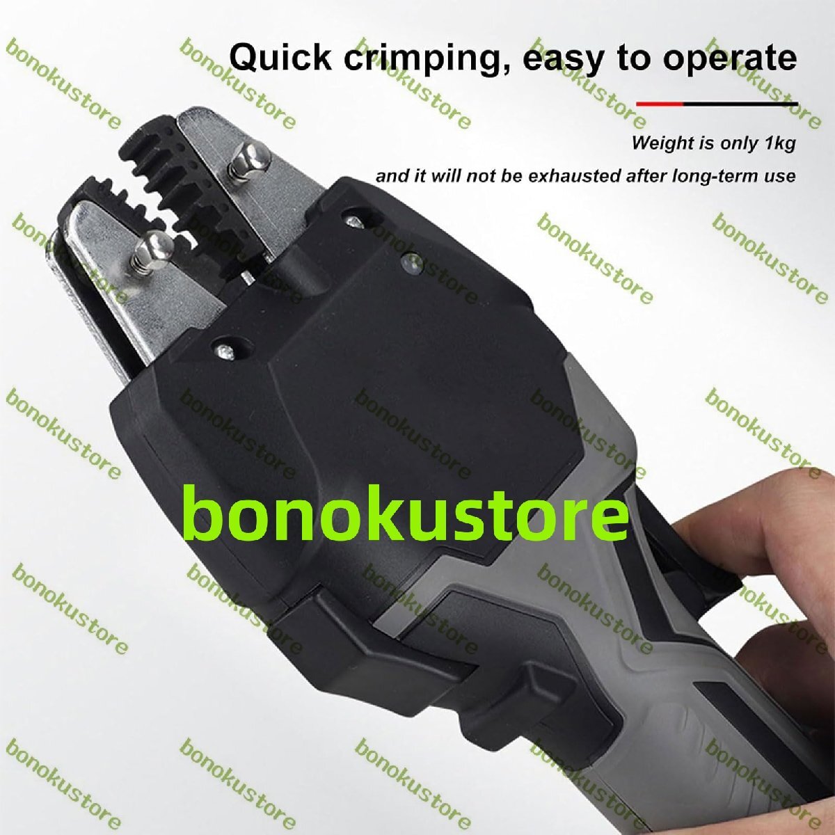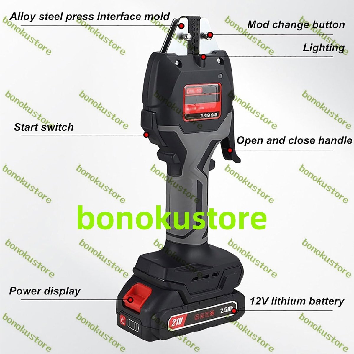 名称:電動圧着ペンチ 材質:合金鋼とプラスチック 圧着力:最大16KN バッテリー電圧:21V、2.5Ah 周囲温度: -10°C~+40°C 商品サイズ:30×11×7cm 梱包サイズ:34×31×10cm パッケージ内容: 電動圧着ペンチ×1 6×型 充電器×1 電池2個 収納ボックス×1