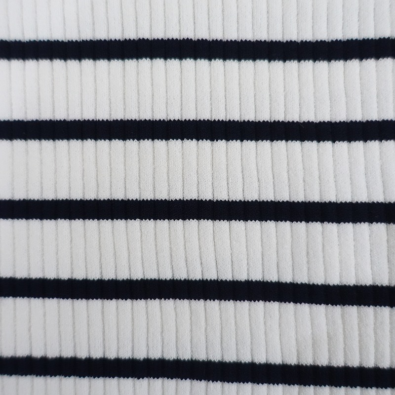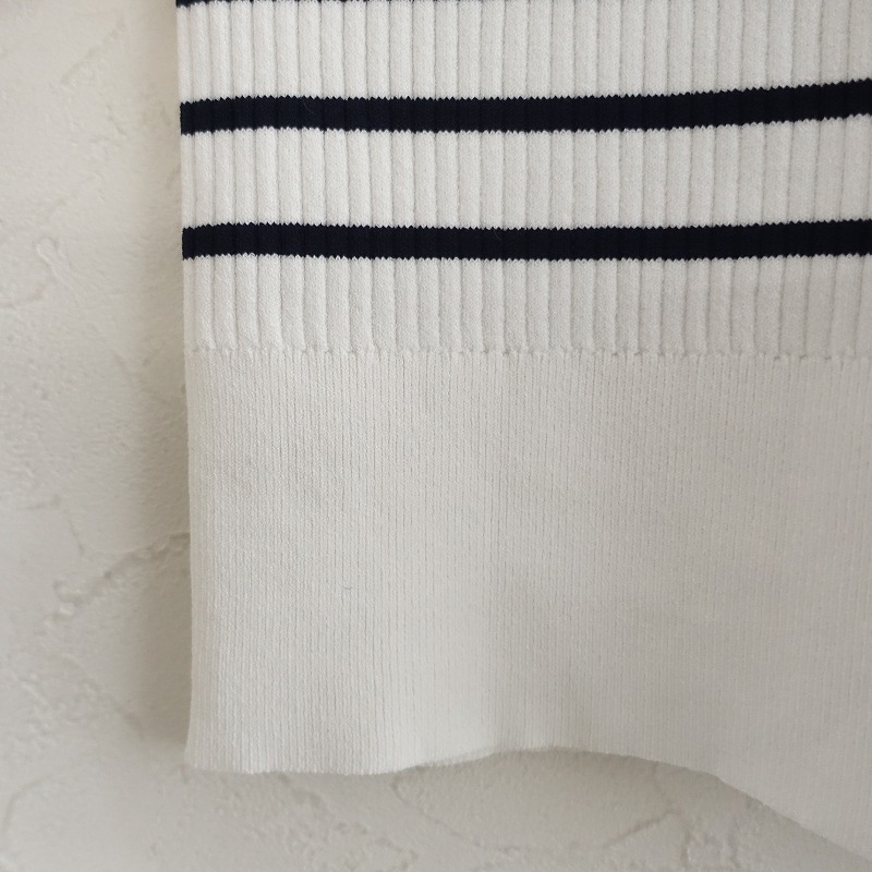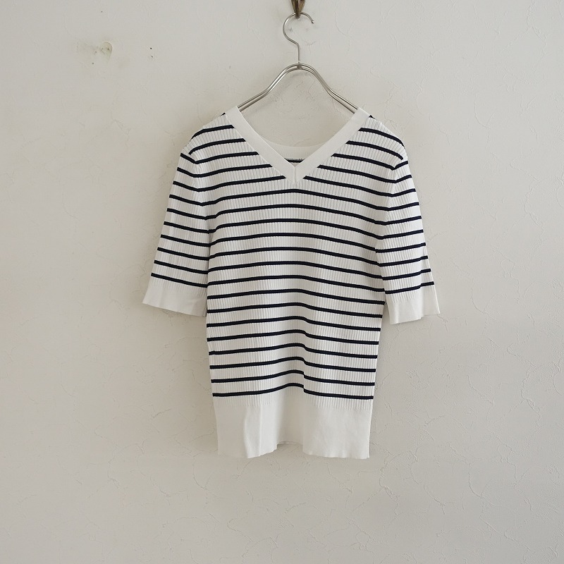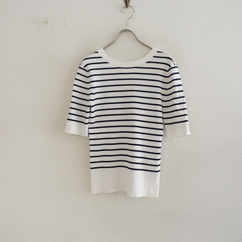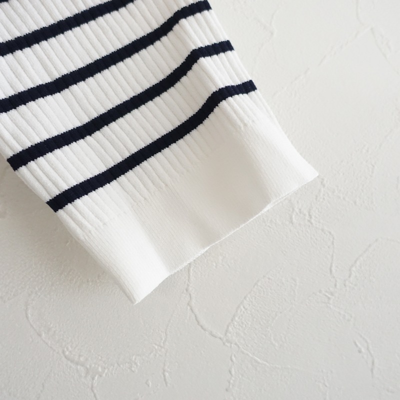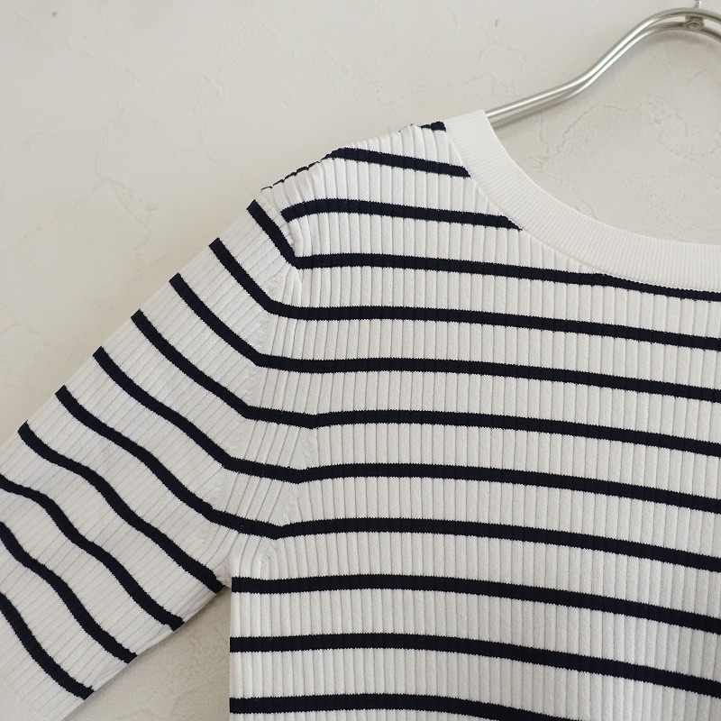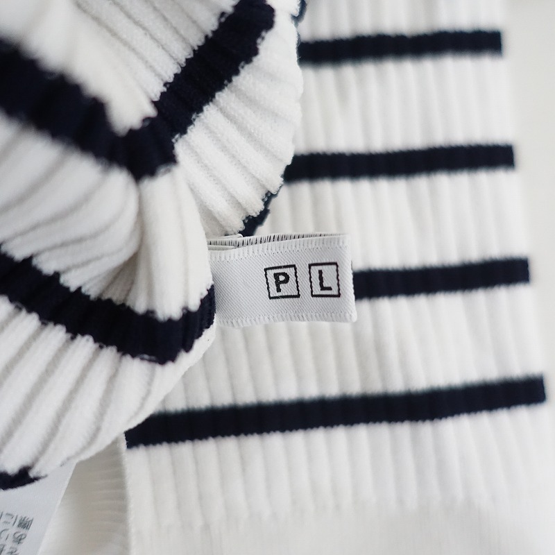| PLSTのボーダーリブニットカットソーです。カラーはホワイト、ブラックのボーダーで、リブニット素材で仕立てられています。プルオーバータイプで、衿ぐりはクルーネックとVネックのデザインです。 |