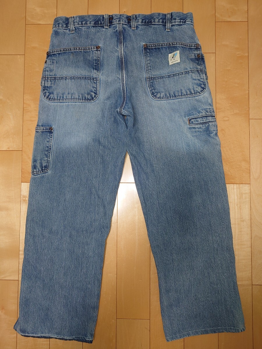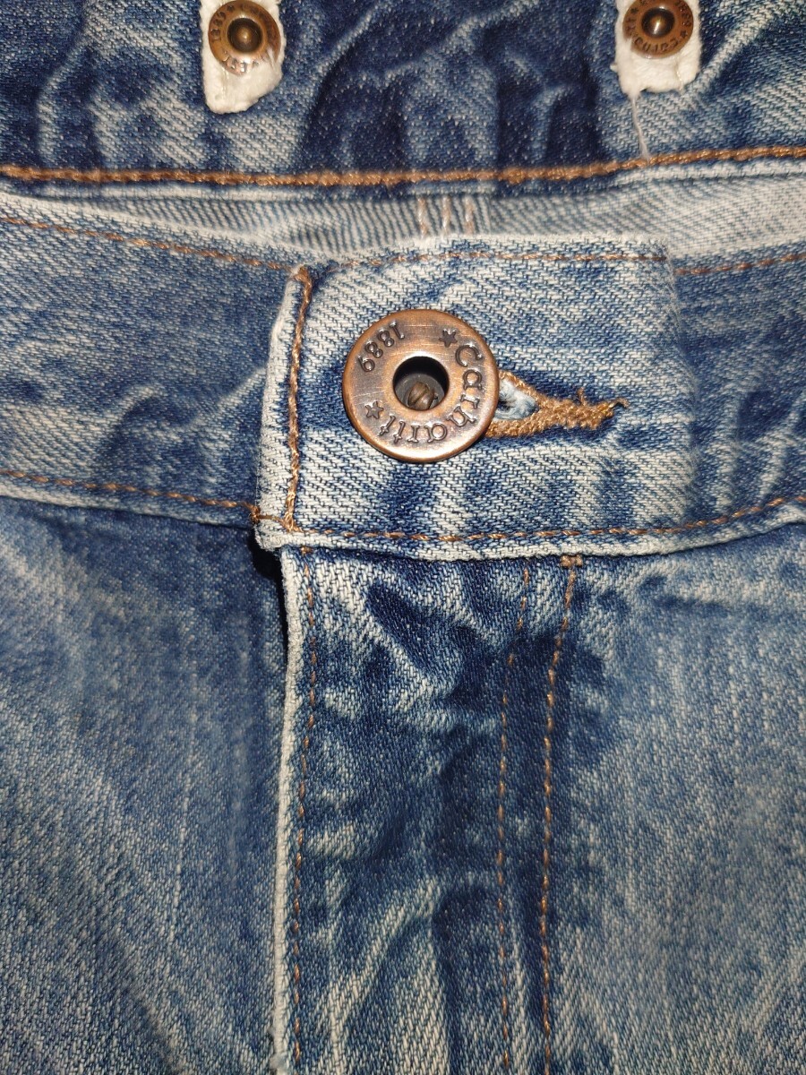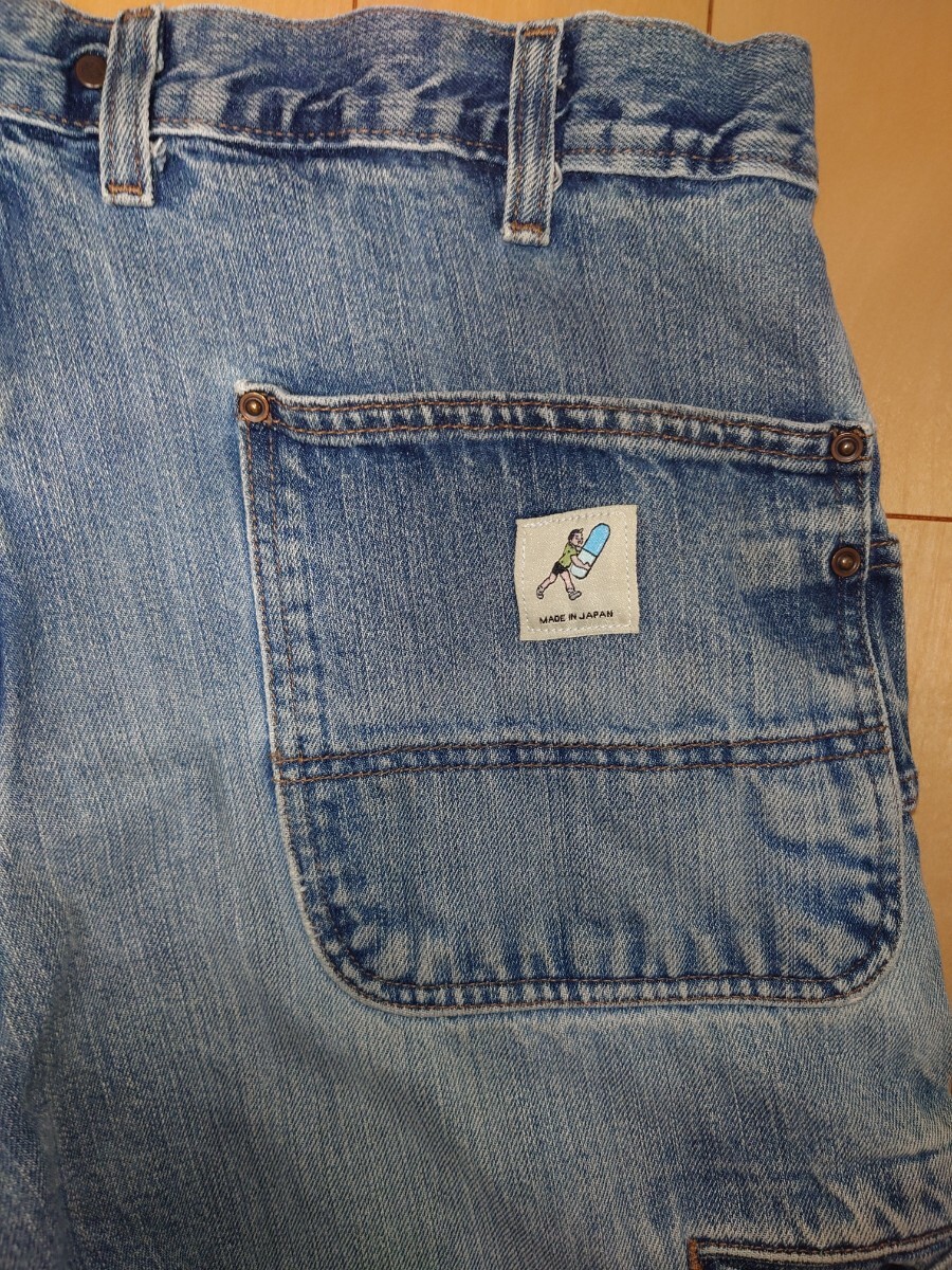 usedのカーハートデニムを再構築していますので、あたりが出て凹凸感があります。