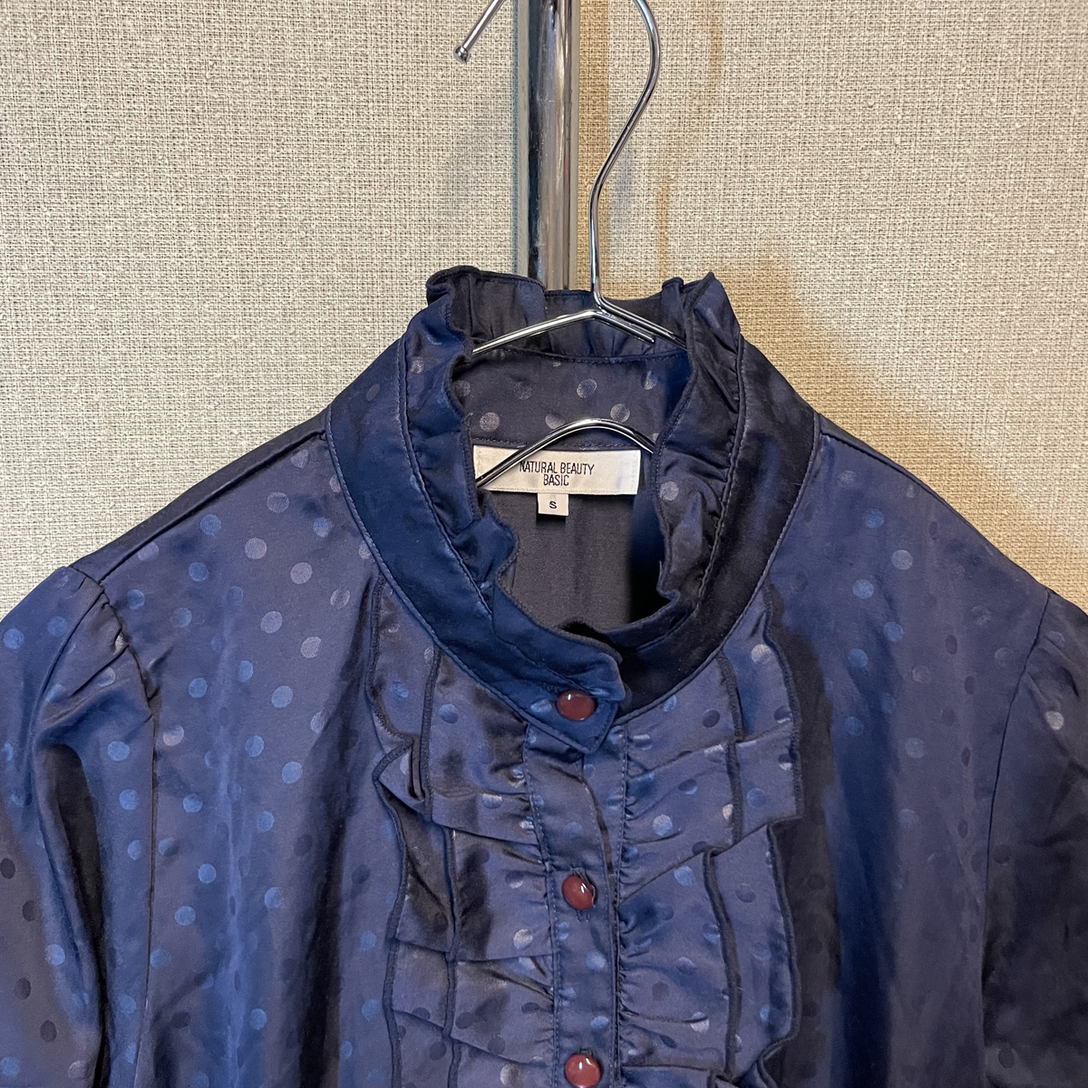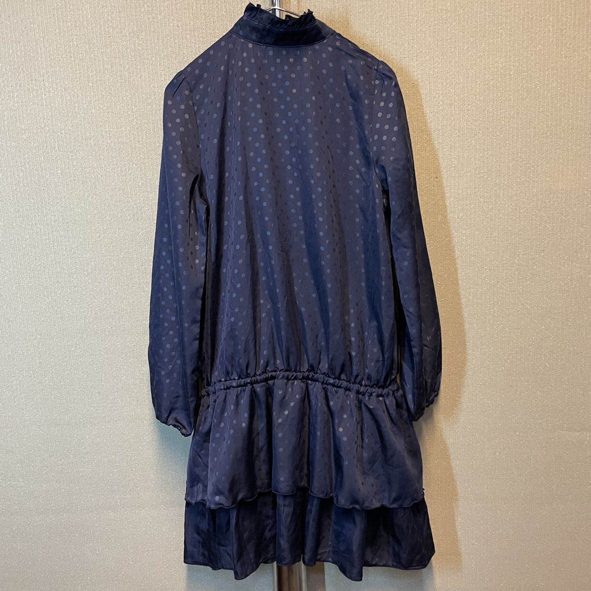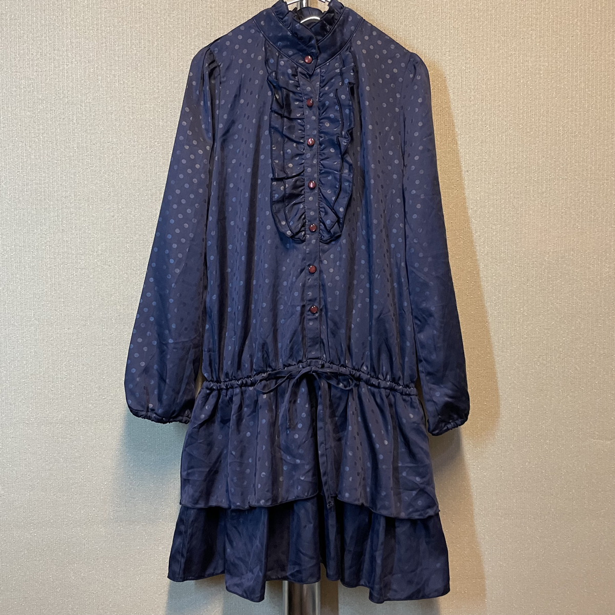 NATURAL BEAUTY ナチュラルビューティー ネイビー同色ボット フリル ティアード ハイネックワンピース Sサイズ