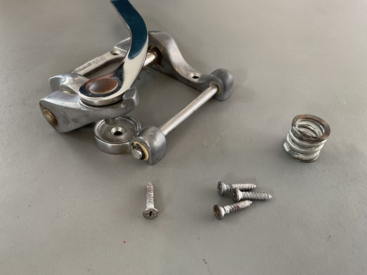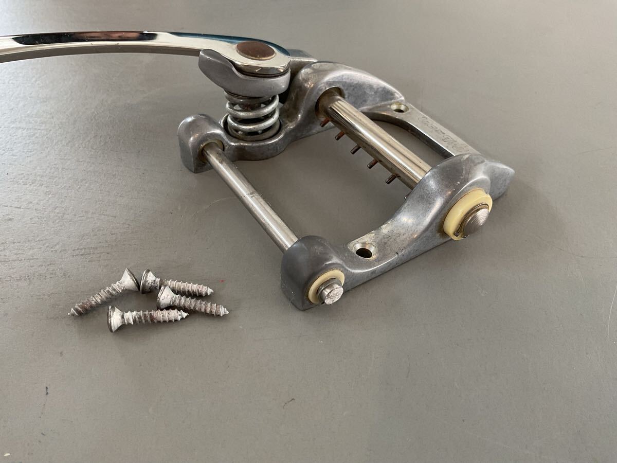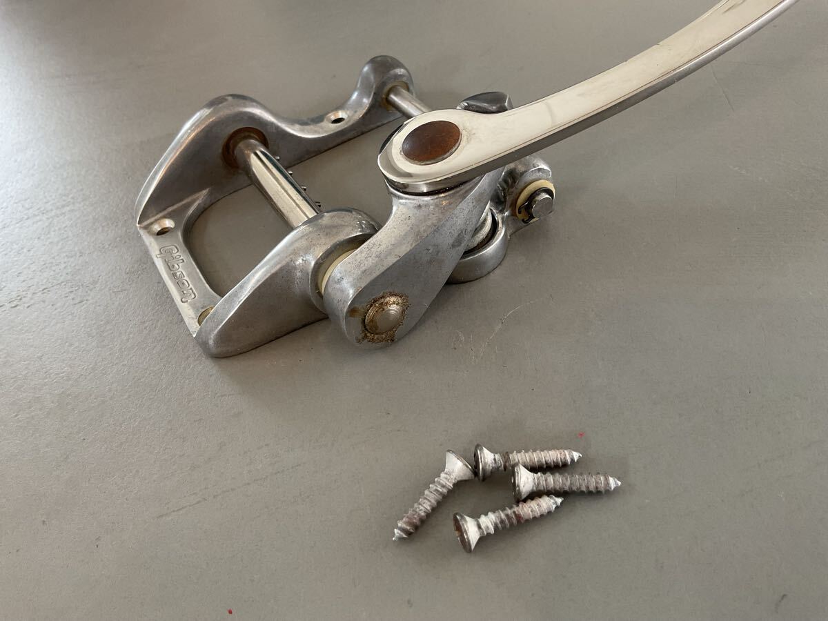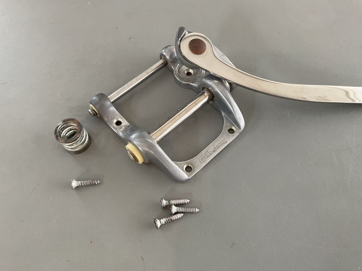 ギブソン 純正 1970年台の初期に使われていたbigsby製のギブソンネームのB-5です。小さいところですが細い方のテンションバーのストッパーリングが交換されています。