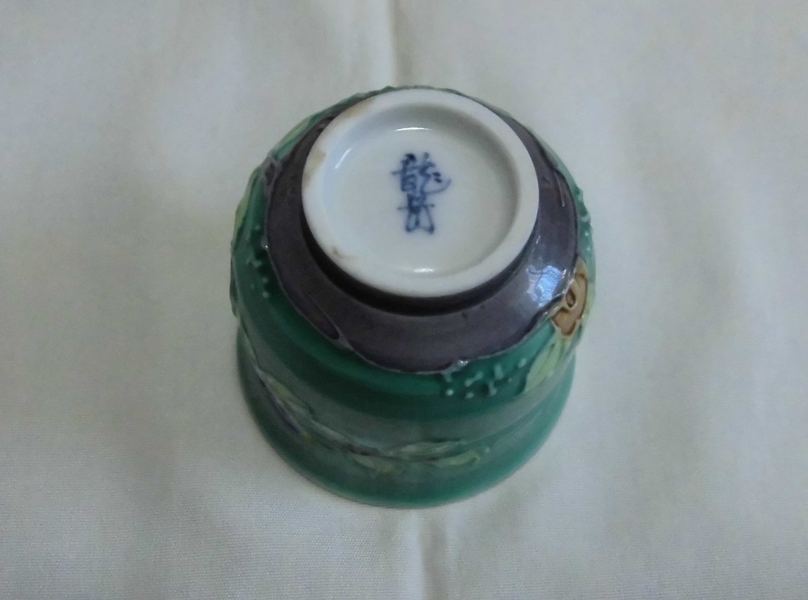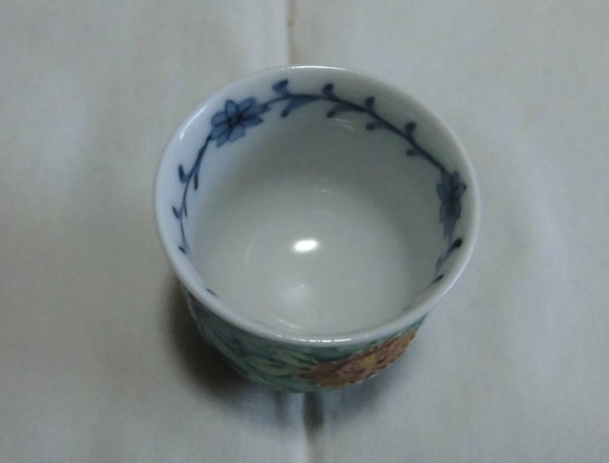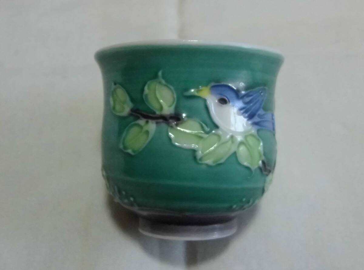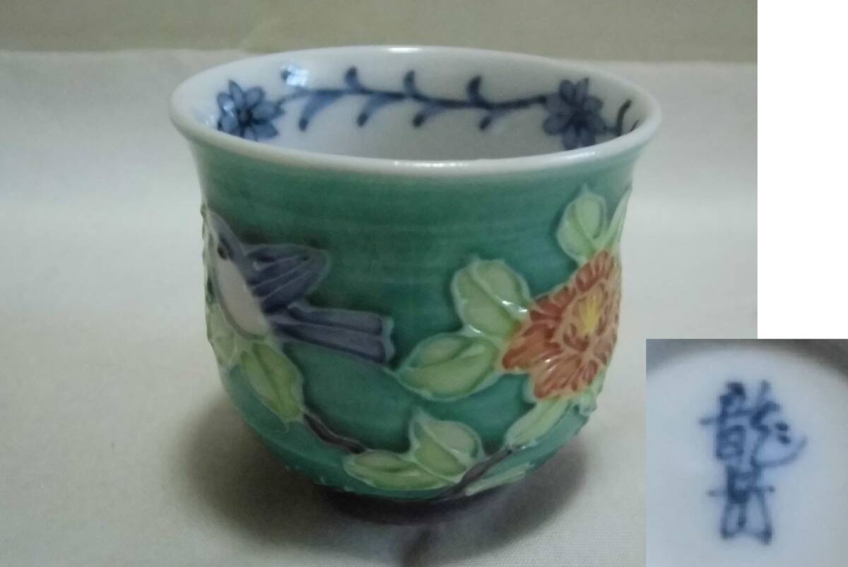 ぐい呑み 龍岳 牡丹と鳥柄 色絵 内側にも柄 染付 柄に凹凸有り お猪口 盃 杯 日本酒 酒器 工芸品 陶器 レトロ アンティーク