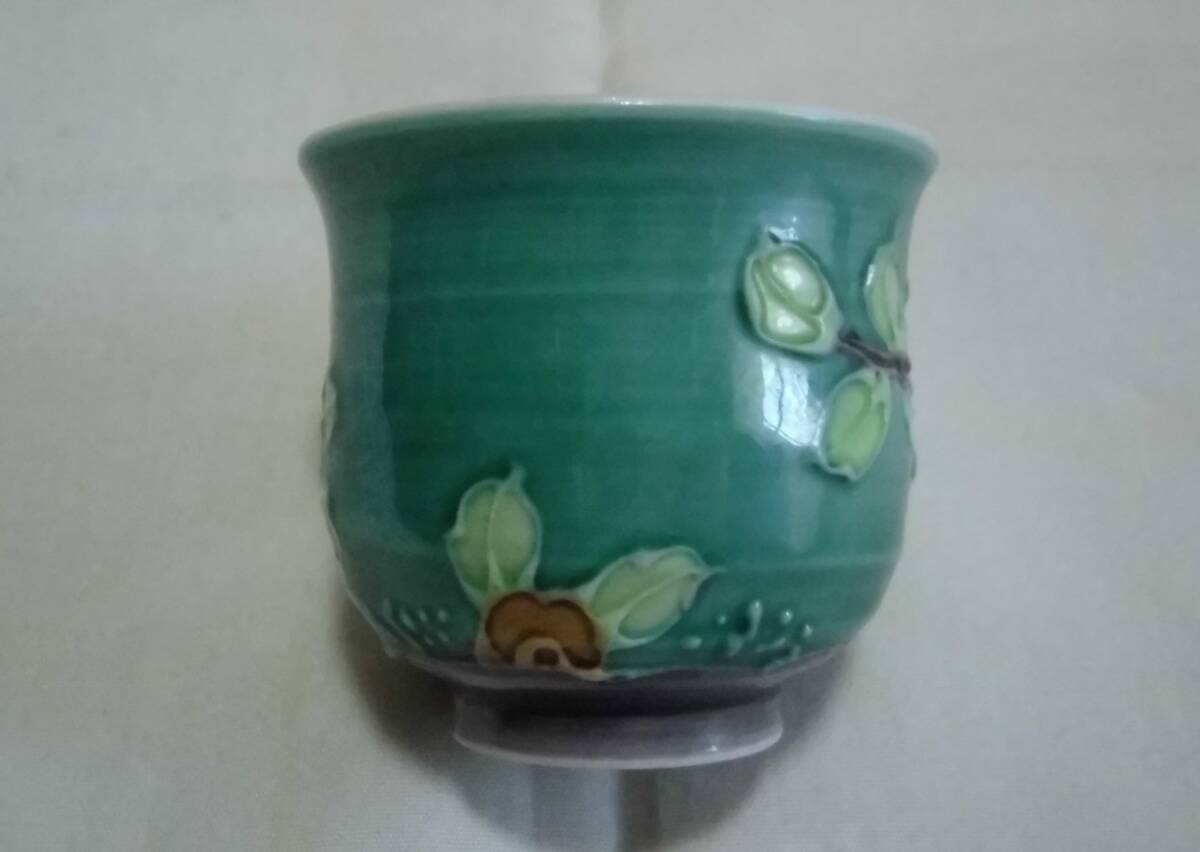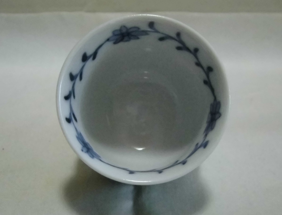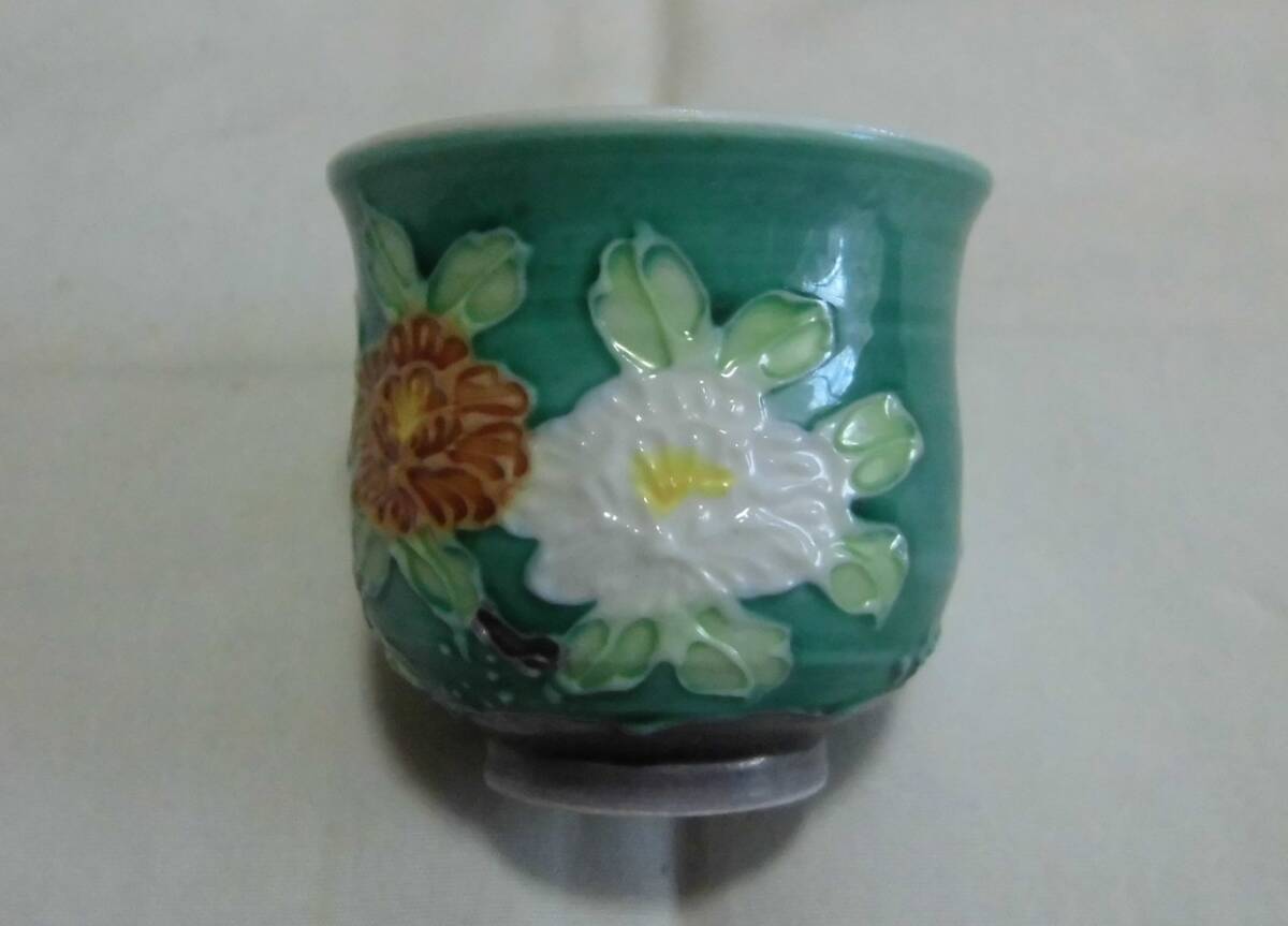 ぐい呑み 龍岳 牡丹と鳥柄 色絵 内側にも柄 染付 柄に凹凸有り お猪口 盃 杯 日本酒 酒器 工芸品 陶器 レトロ アンティーク