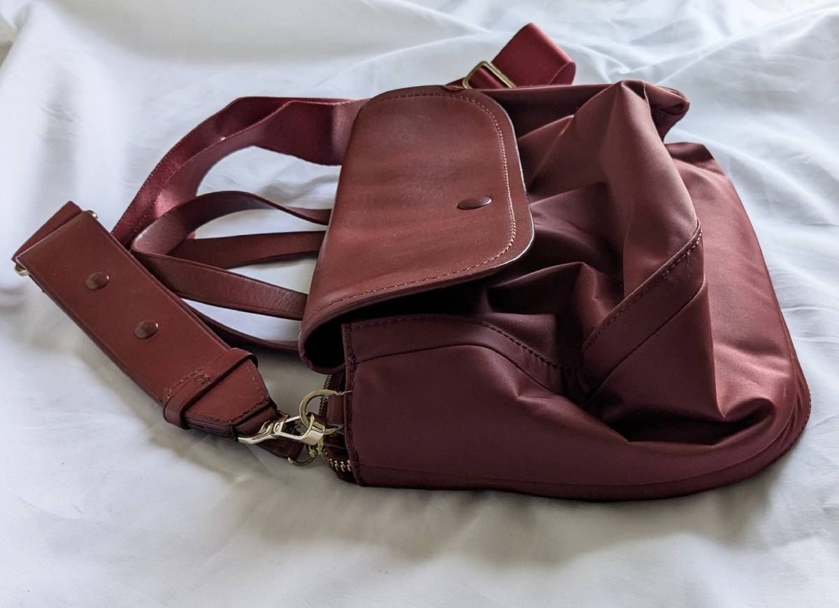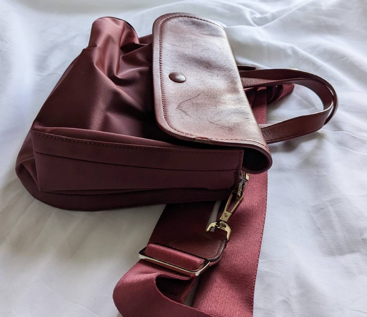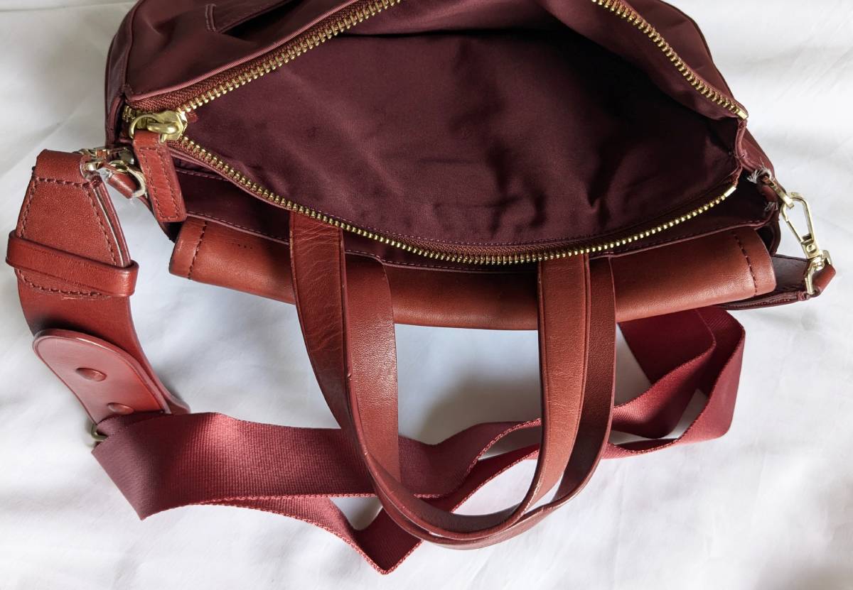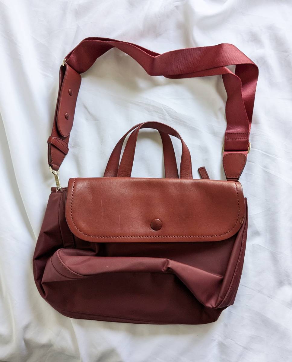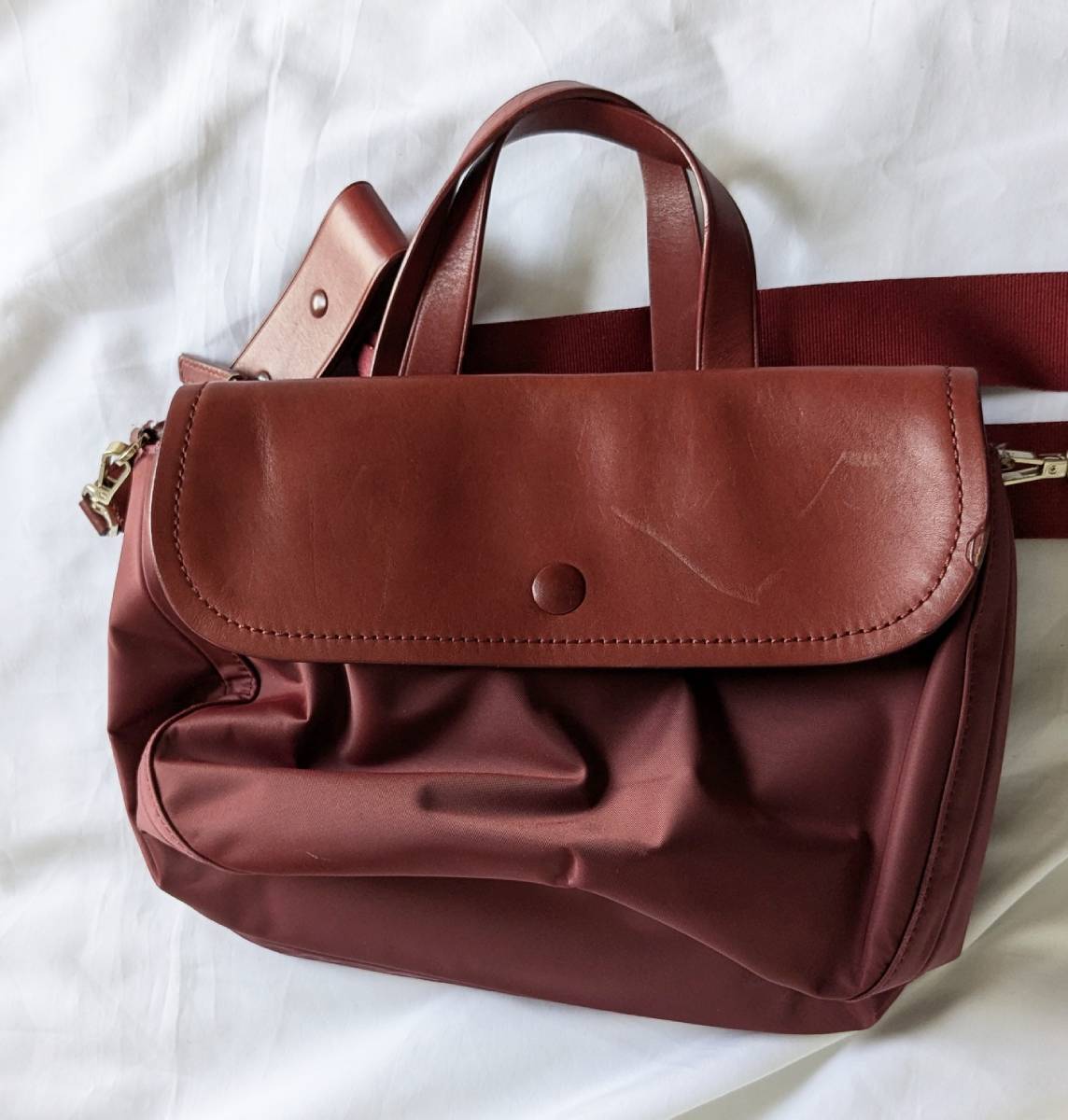 素材ナイロン80%、牛革20%、サイズ縦約20cm、横約28cm、マチ約11cm