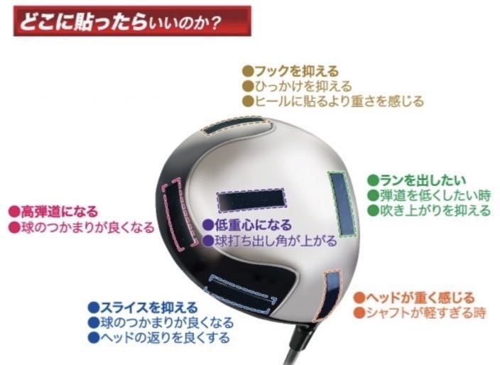 ドライバーは貼る事ができる場所が多く、貼る位置により効果が変わりますので、画像を参考に位置を調整ください。