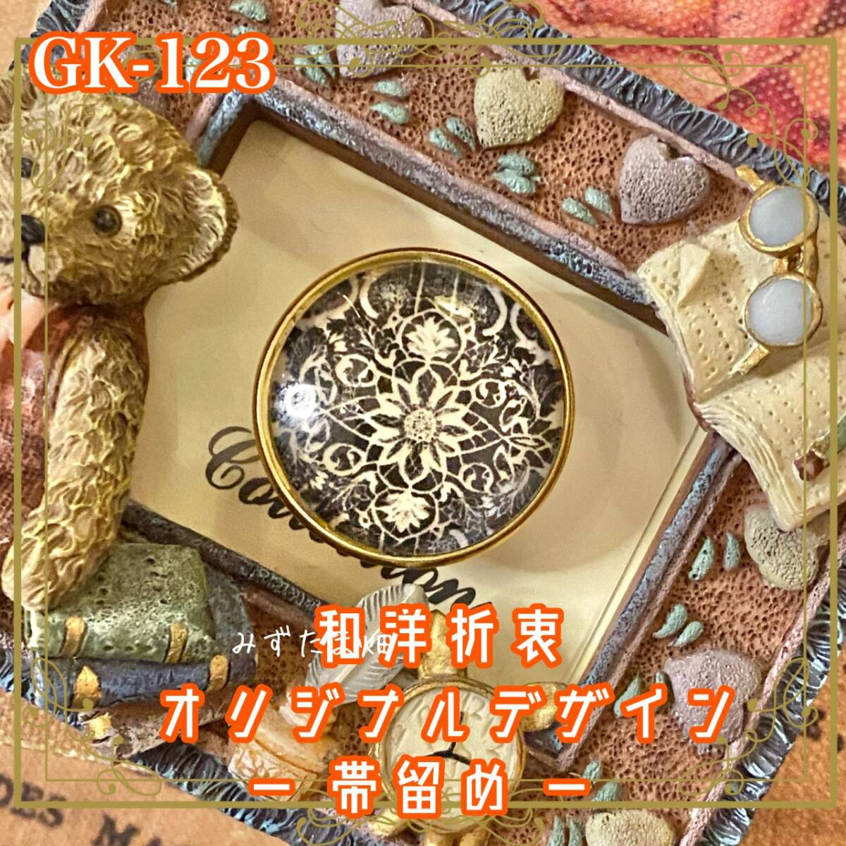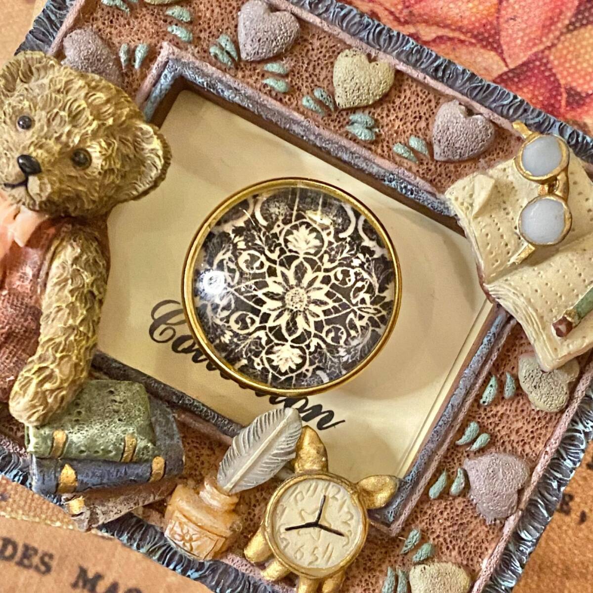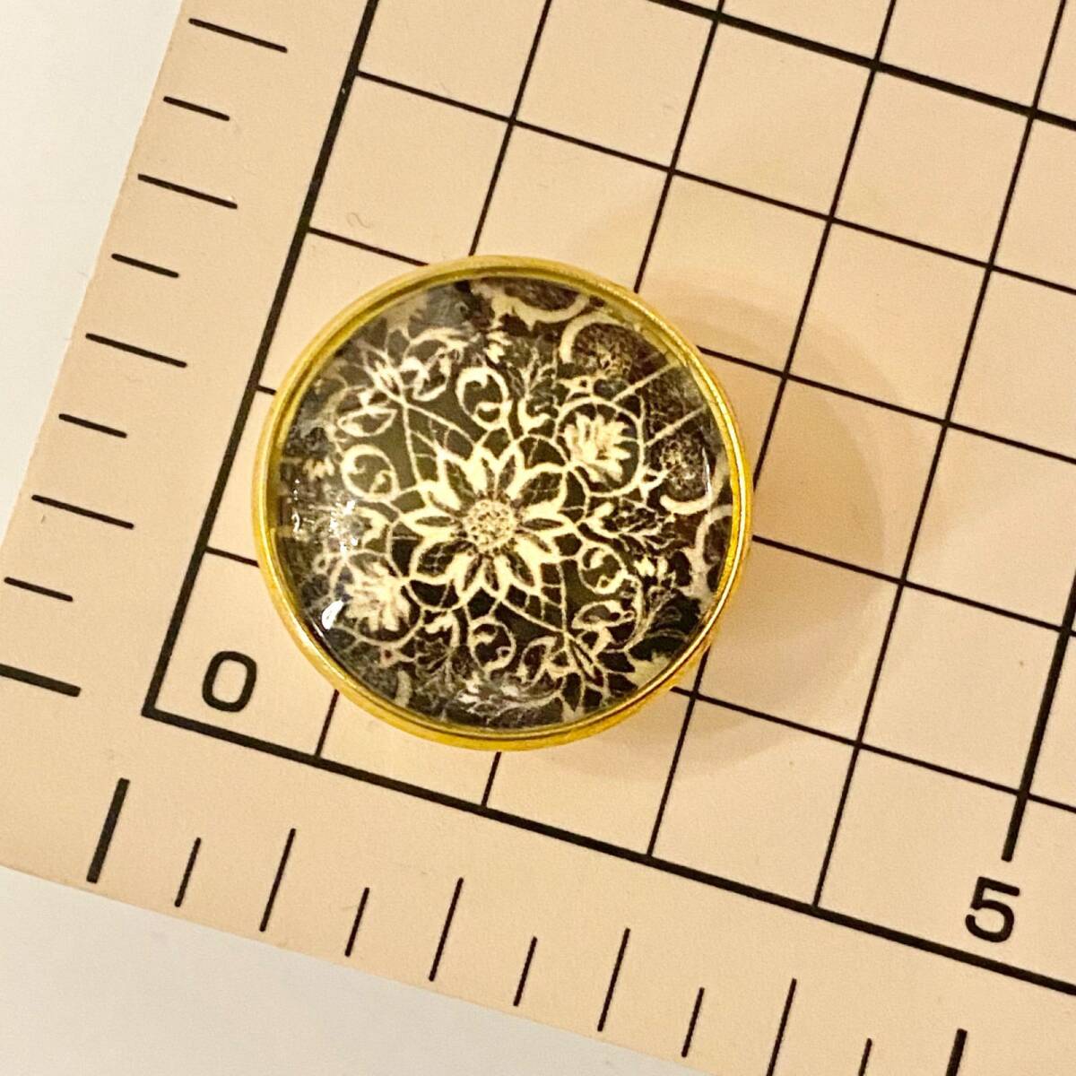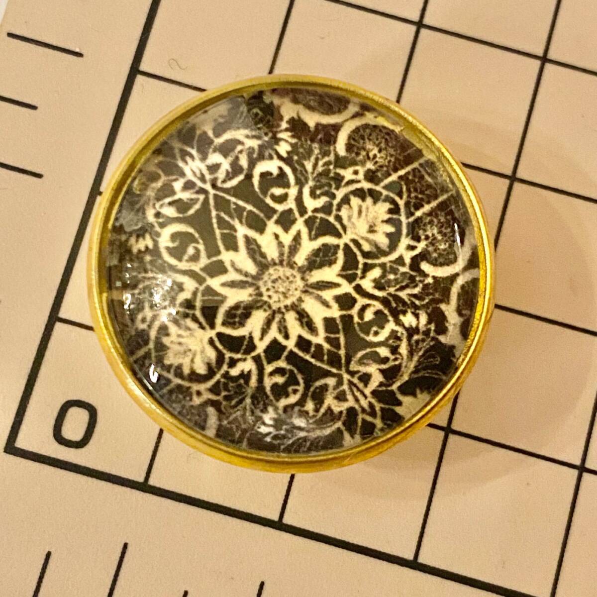 【着物リメイク ガラス帯留め 和洋折衷 和ロリータ ハンドメイド アクセサリー 黒の静けさを背景に、白く浮かび上がるレースの花々。 GK-123】