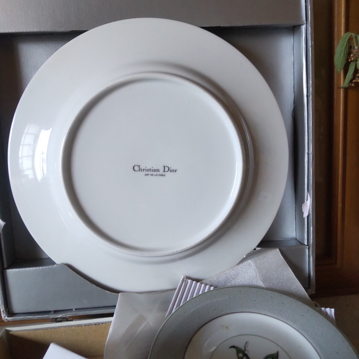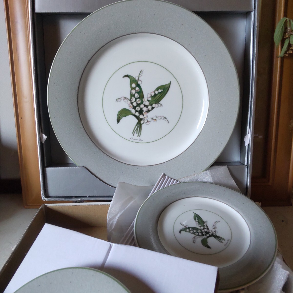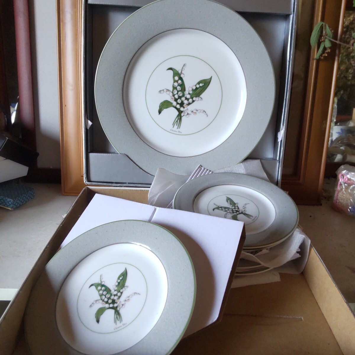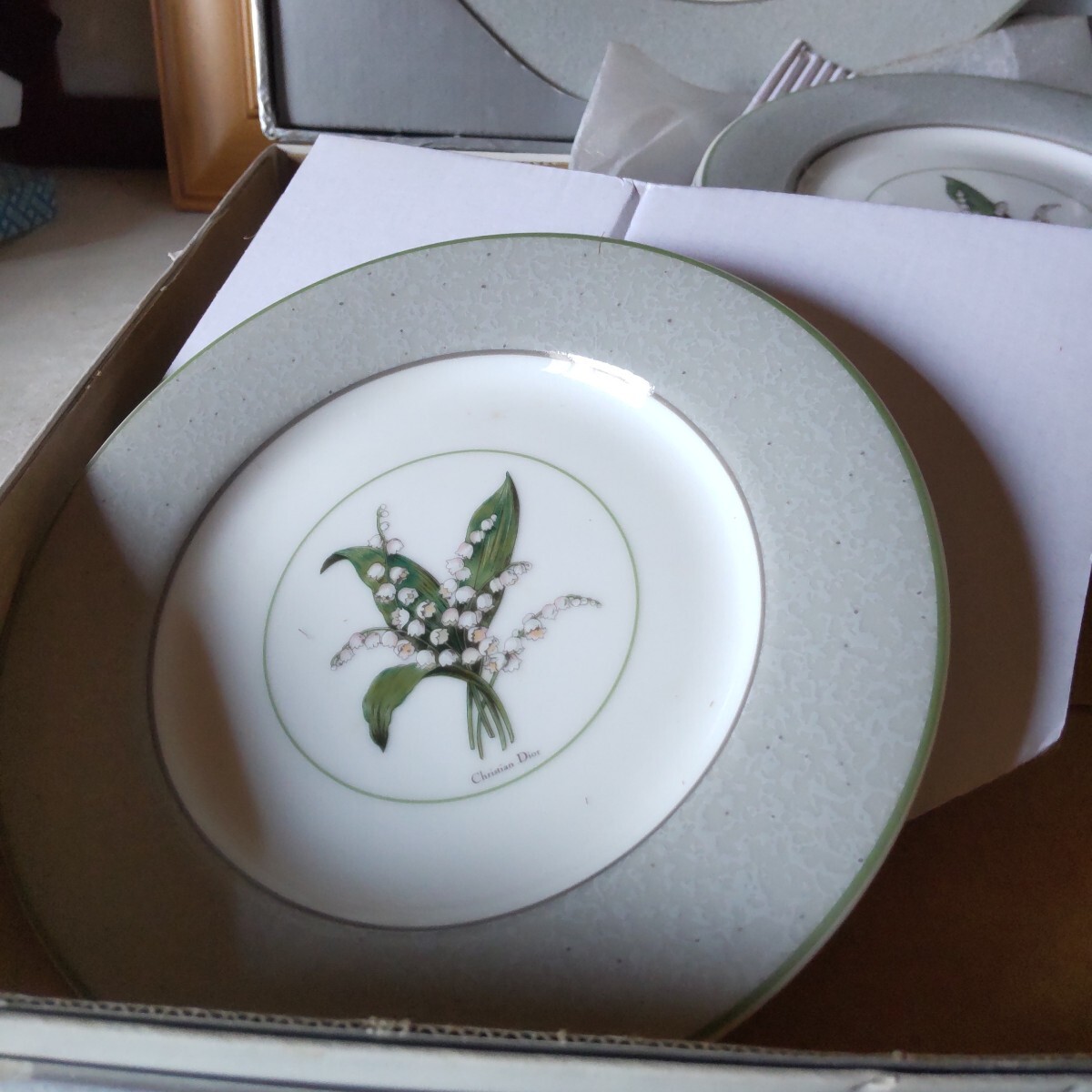 保管品の人気のすずらんのクリスチャンディオ―ルのプレートセットです未使用です。6枚組(大皿1枚ケ―キ皿5枚)。古い物ですので、保管による黄ばみが有ります。(洗ったら落ちる程度)シルバーの紙箱付き(写真10)。当方知識が有りません。お好きな方インテリアに。日常使いに。