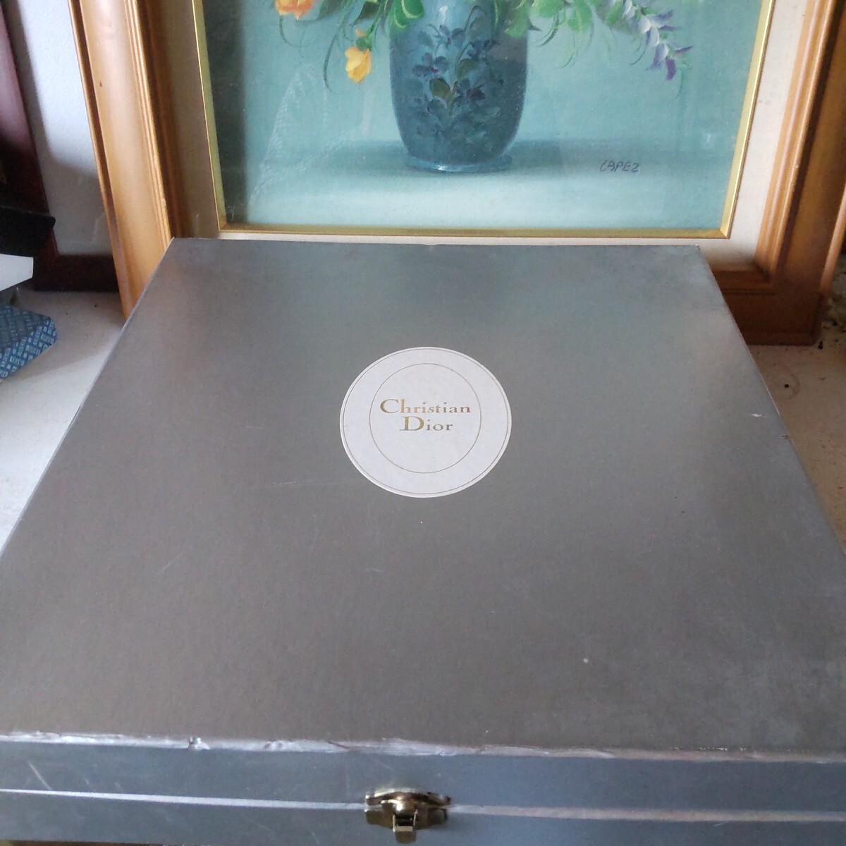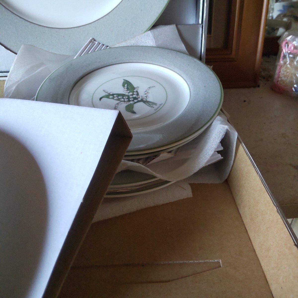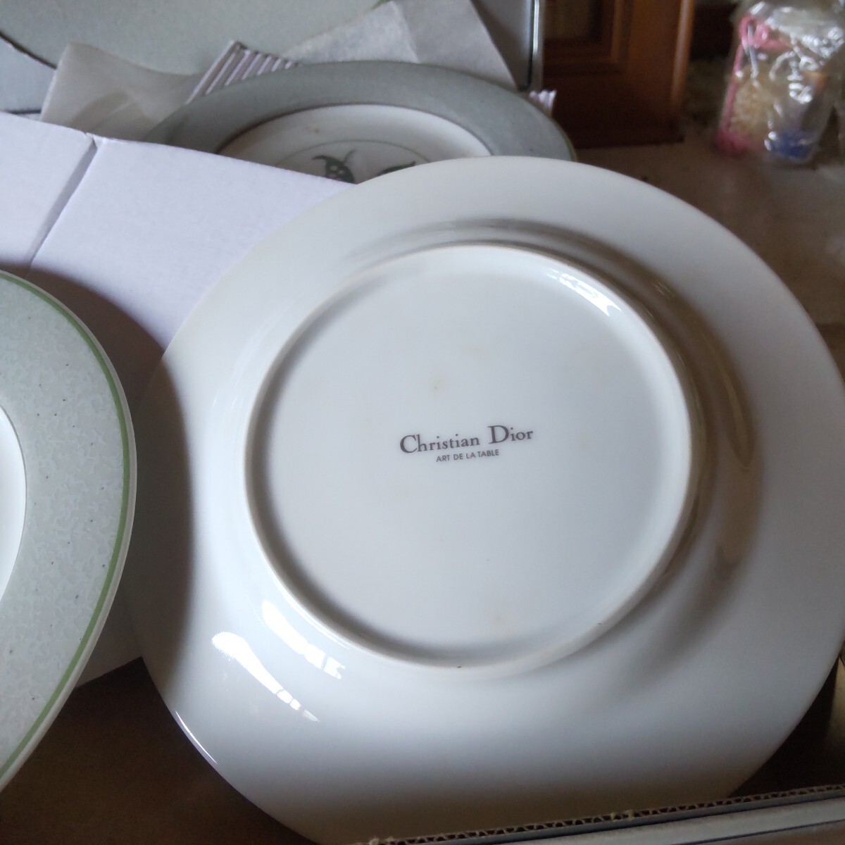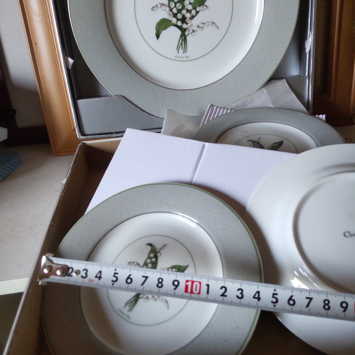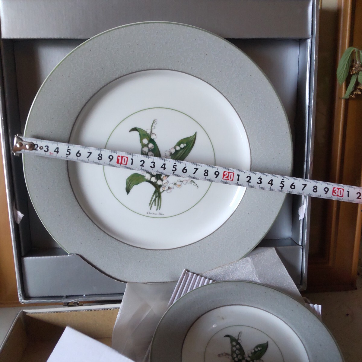 保管品の人気のすずらんのクリスチャンディオ―ルのプレートセットです未使用です。6枚組(大皿1枚ケ―キ皿5枚)。古い物ですので、保管による黄ばみが有ります。(洗ったら落ちる程度)シルバーの紙箱付き(写真10)。当方知識が有りません。お好きな方インテリアに。日常使いに。
