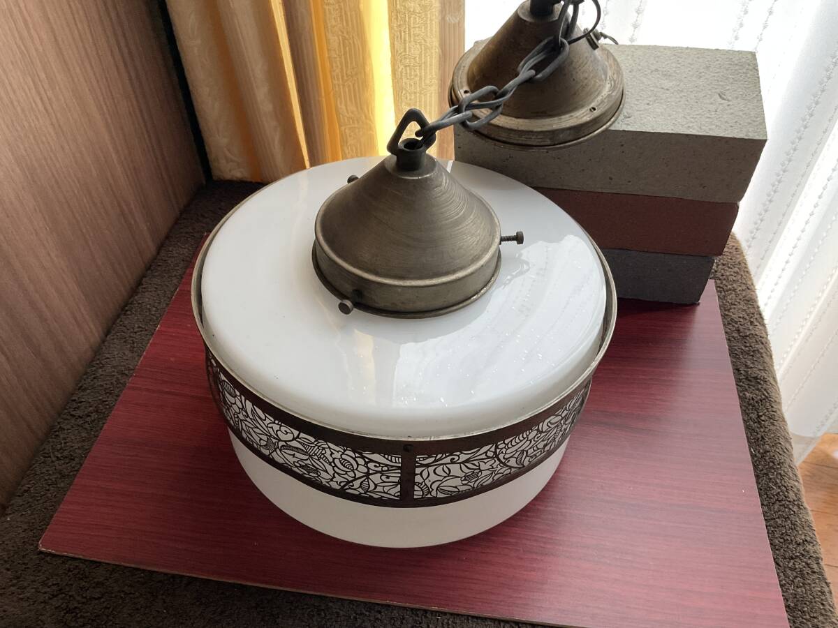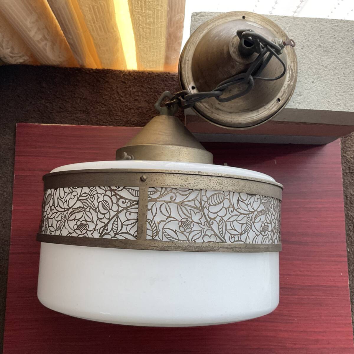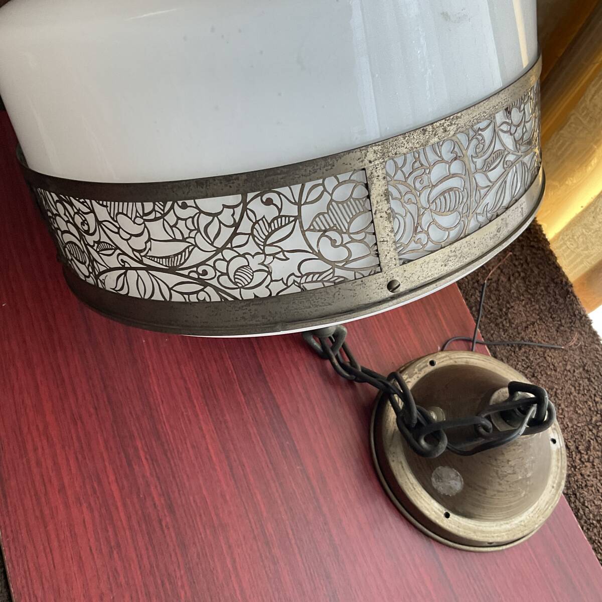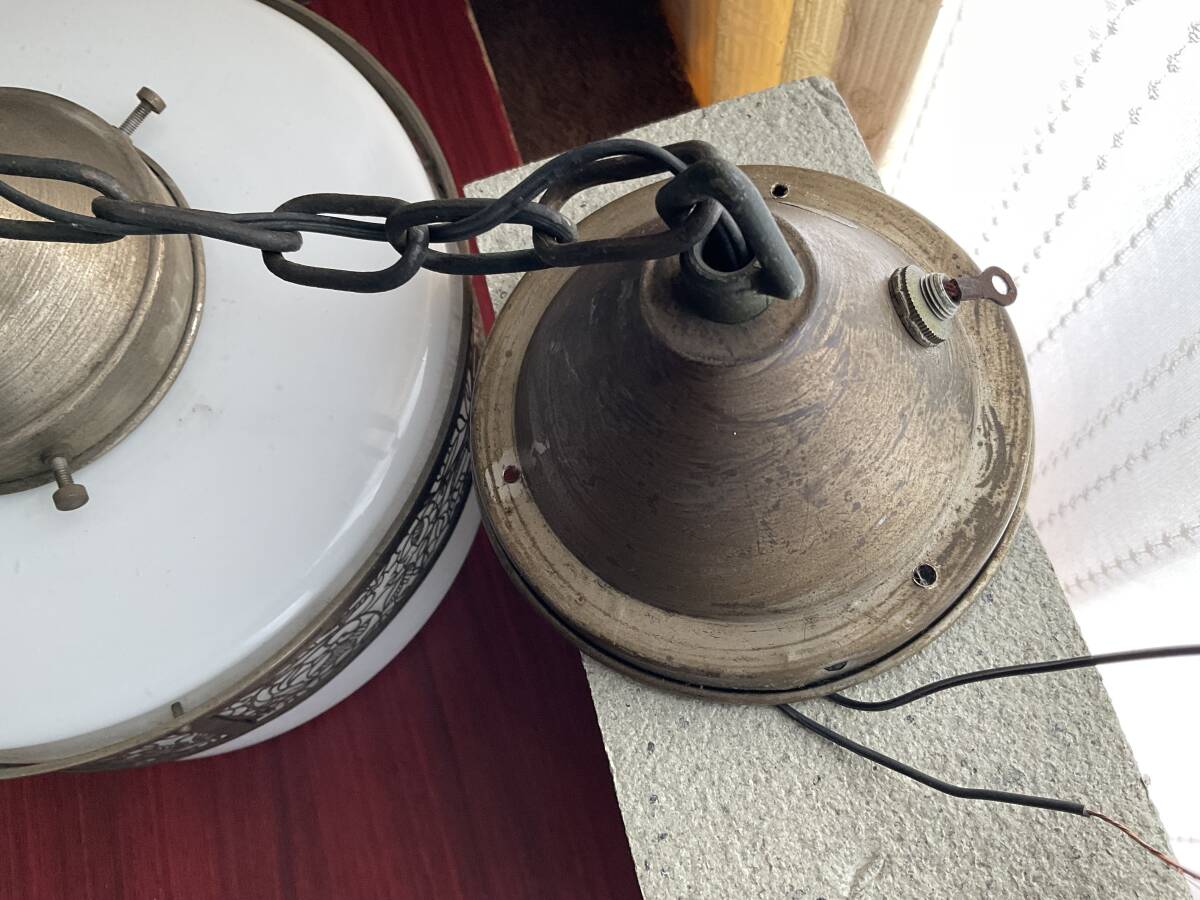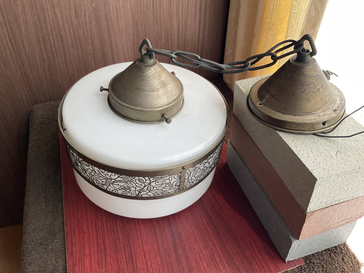 即決【大正浪漫びいどろ屋】草花文様金属装飾巻き 乳白ガラスシェード付き一灯吊り照明 アンティーク リフォーム 古民家 カフェ 電笠 アールヌーボー 鎖