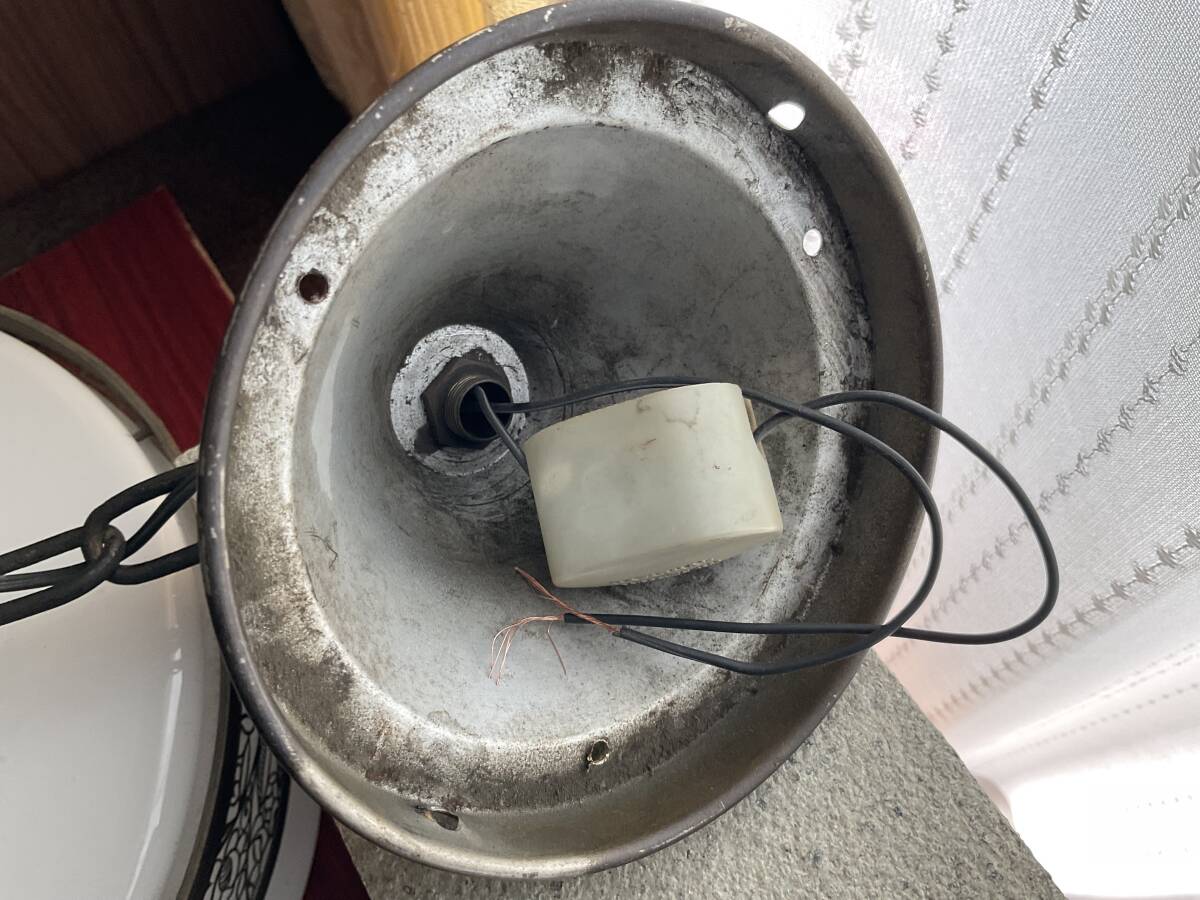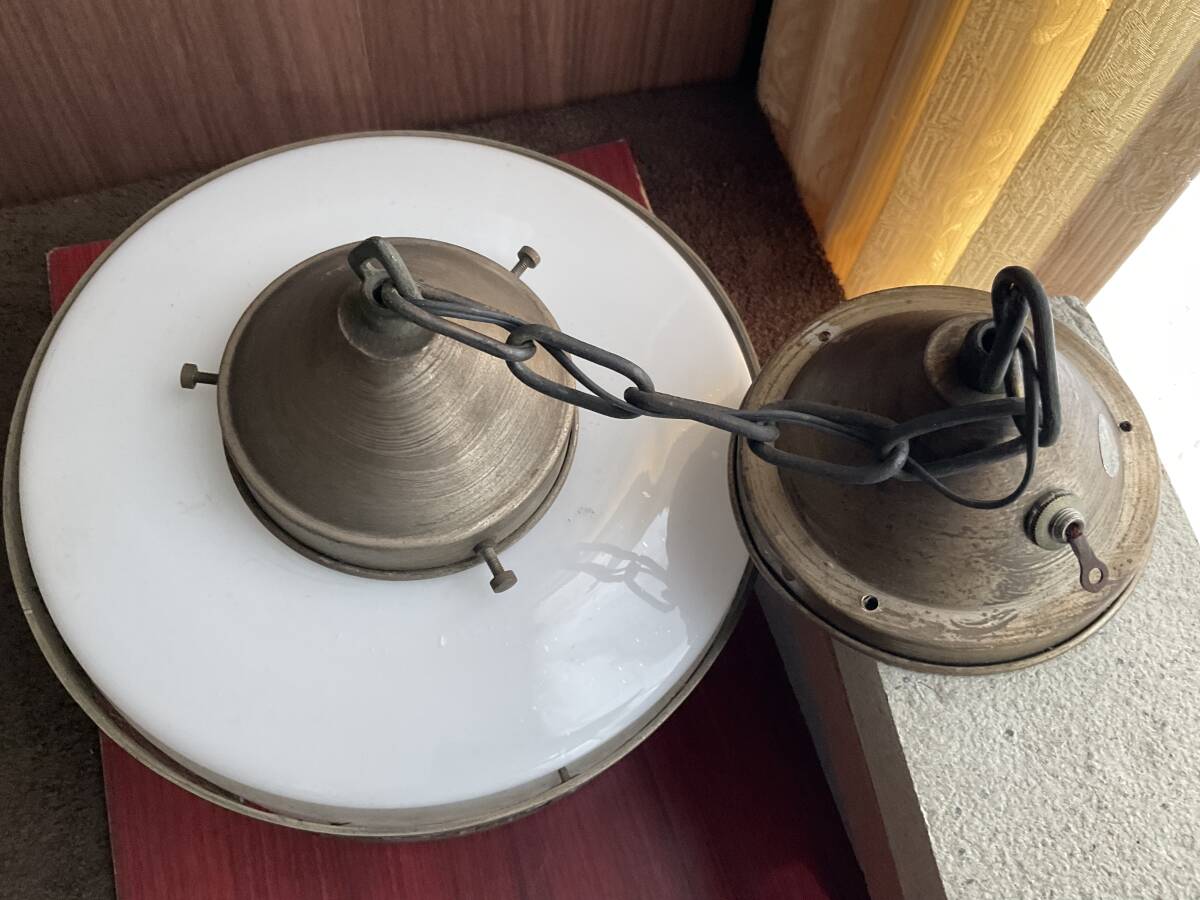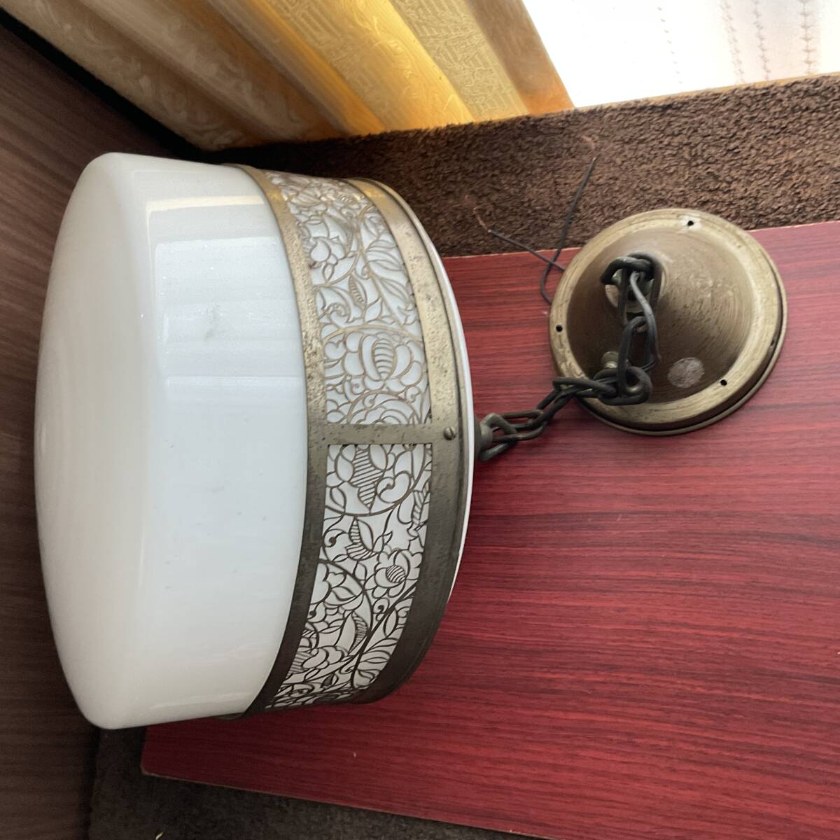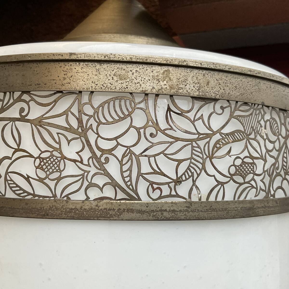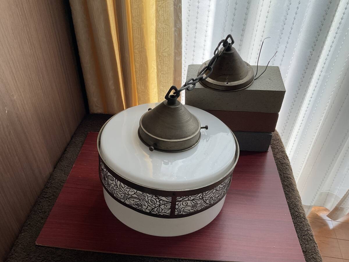即決【大正浪漫びいどろ屋】草花文様金属装飾巻き 乳白ガラスシェード付き一灯吊り照明 アンティーク リフォーム 古民家 カフェ 電笠 アールヌーボー 鎖