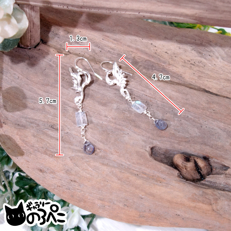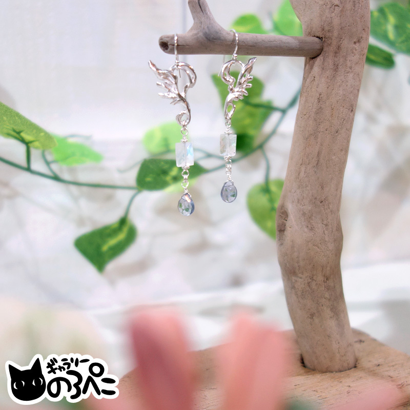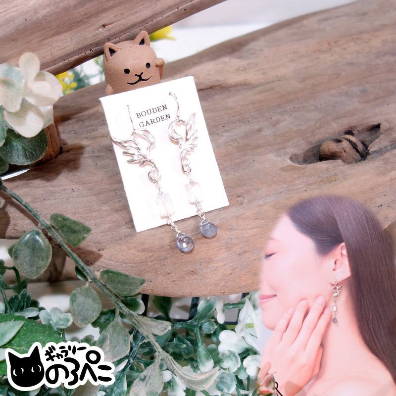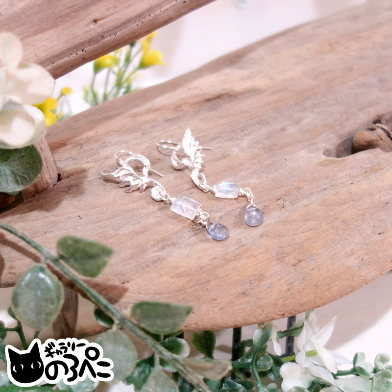 ブルームーンストーンとアイオライトのシルバーピアス(羽の純銀モチーフとsv925のピアス) bc823-a125