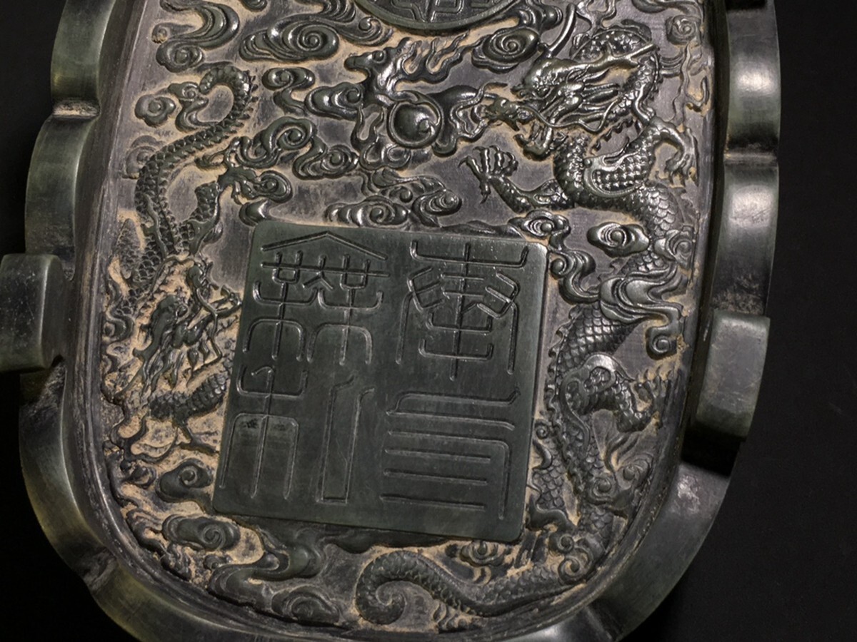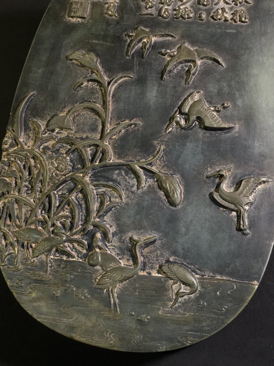 【瓏】松花石彫 鶴鳴九皋文房蓋硯 乾隆清玩銘 清時代 手彫り 文房四寶 書道具 古硯 端硯 古美術 蔵出