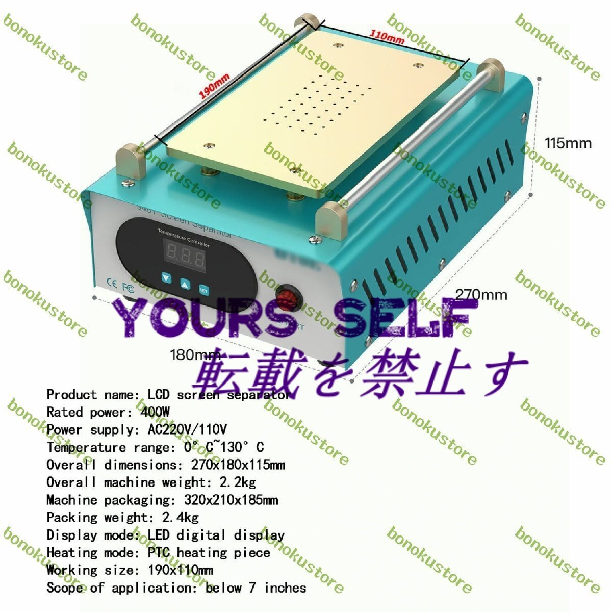 製品名: 液晶画面セパレーター 定格電力: 400W 電源:AC220V/110V 温度範囲:0℃~130℃ 全体寸法: 270x180x115mm 機械全体の重量: 2.2kg 機械の梱包: 320x210x185mm 梱包重量:2.4kg 表示モード:LEDデジタルディスプレイ 加熱モード: PTC 加熱ピース 作業サイズ: 190x110mm 適用範囲:7インチ以下 パッケージ: ホスト×1 シリコンパッド×1 電源コード×1 説明書×1