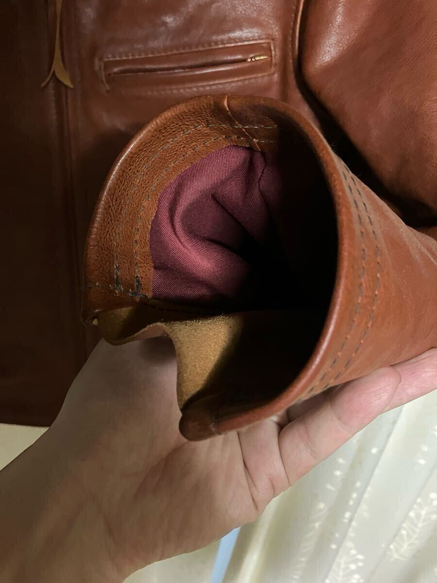 バダラッシカルロ社のNAPPA LUX にウェットバックという経年加工を施したユーフラテというレザーで、当時、赤茶系のレザージャケットが欲しかったのでオルモというカラーで制作してもらいました。
