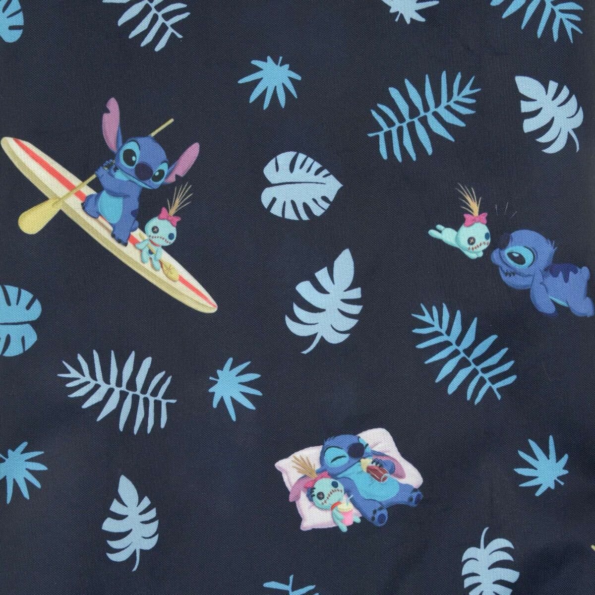 スティッチとスクランプの可愛いイラストがモンステラなどの南国リーフとともに散りばめられた総柄プリントデザインです。