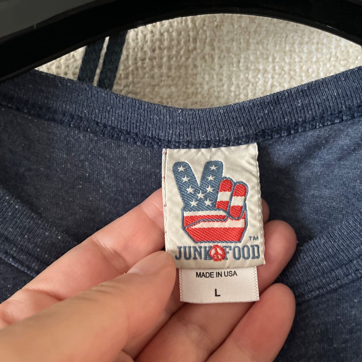 JUNKFOOD購入。半袖Tシャツ。インディゴブルー。Lサイズ。USA古着 00s。スターウォーズのダースベイダーが大きくプリントされています。男性用か女性用か不明ですがユニセックスで着れます。よくあるTシャツの生地ではなく柔らかめのコットンTシャツです。オーバーサイズではありません。スターウォーズファンの方いかがでしょうか。興味がない方でもすごくオシャレに見えると思います。肩幅48cm、身幅58cm、総丈73cm位です。他にもたくさん出品予定しています。覗いて見てください\( 'ω')/