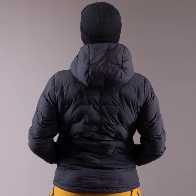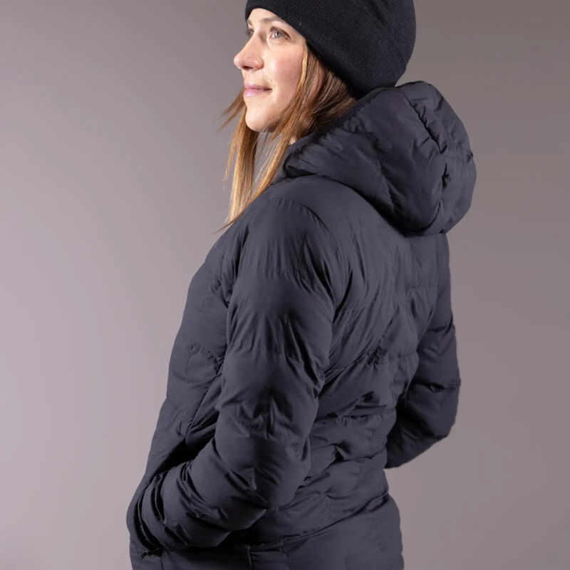 Women’s Dark Start Recycled Hoodie(ウィメンズ・ダークスタート・リサイクル・フーディー)は、山で素早く行動するときにも、ドライで暖かい状態を保つように設計された、テクニカル・インサレーション・レイヤーです |