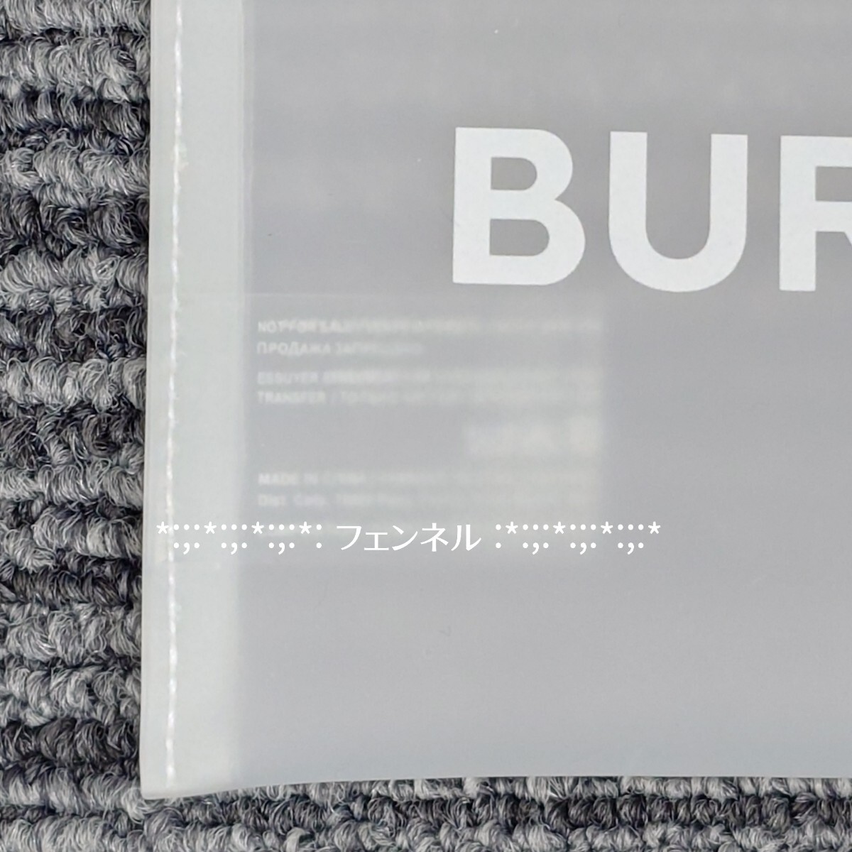 バーバリーのフラットポーチです。中央に大きなロゴが入っていて、すぐにバーバリーだとわかります。あえて半透明なところも、とってもおしゃれです。防水素材で薄くてかさばりません。ファスナー持ち手部分はシリコンっぽい素材ですが、ゴミが付着している場合がありますのでご了承ください。