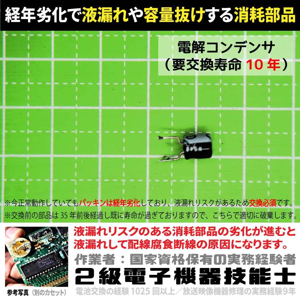 要交換寿命10年の電解コンデンサは電解液蒸発で容量抜けすると、電圧供給を不安定にし映像音声にノイズを発生させます。パッキンの劣化で液漏れすると基板を腐食させるリスクもあります。この商品は電解コンデンサを正しい工程・温度・加熱時間の半田溶接で交換し寿命延長!劣化した端子を独自技法でピカピカ高温研磨することで一発起動から5回連続起動テストに合格しています。