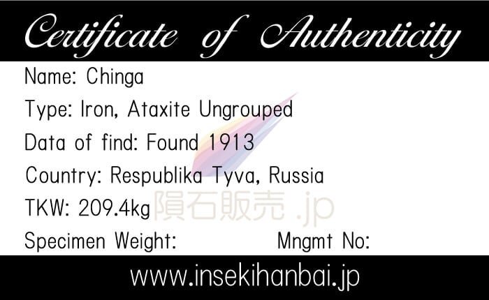 総質量は約209kgで1913年にチンガ川近くの金の掘削業者によって発見され金掘削業者を監督する鉱業エンジニアがサンクトペテルブルグのロシア科学アカデミーに30個のサンプルを送付後にチンガと命名されました。チベットの仏像で高さ24cm重さ10kgの毘沙門天をかたどったアイアンマンは11世紀頃にチンガで作られたものと言われており1938年にナチス親衛隊がチベット遠征で入手し胃の上あたりにハーケンクロイツが彫られています。またチンガが発見された河川堆積物を研究したところ約1万年から2万年前に落下したと推定されています。