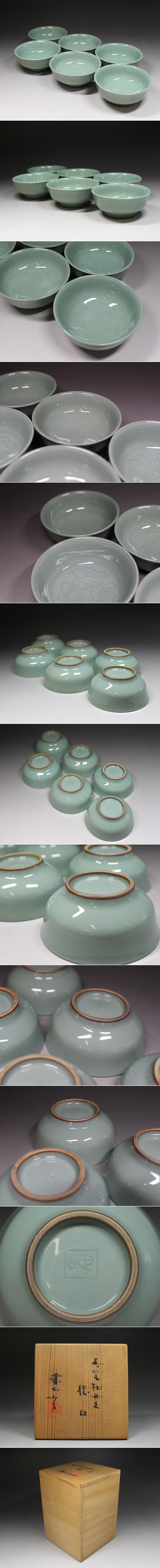 | ■青磁■宮永東山・牡丹文・猪口・6客・酒盃・杯・酒器・共箱・検/諏訪蘇山 三浦竹泉・f6194h | ||||||||||||||||||||