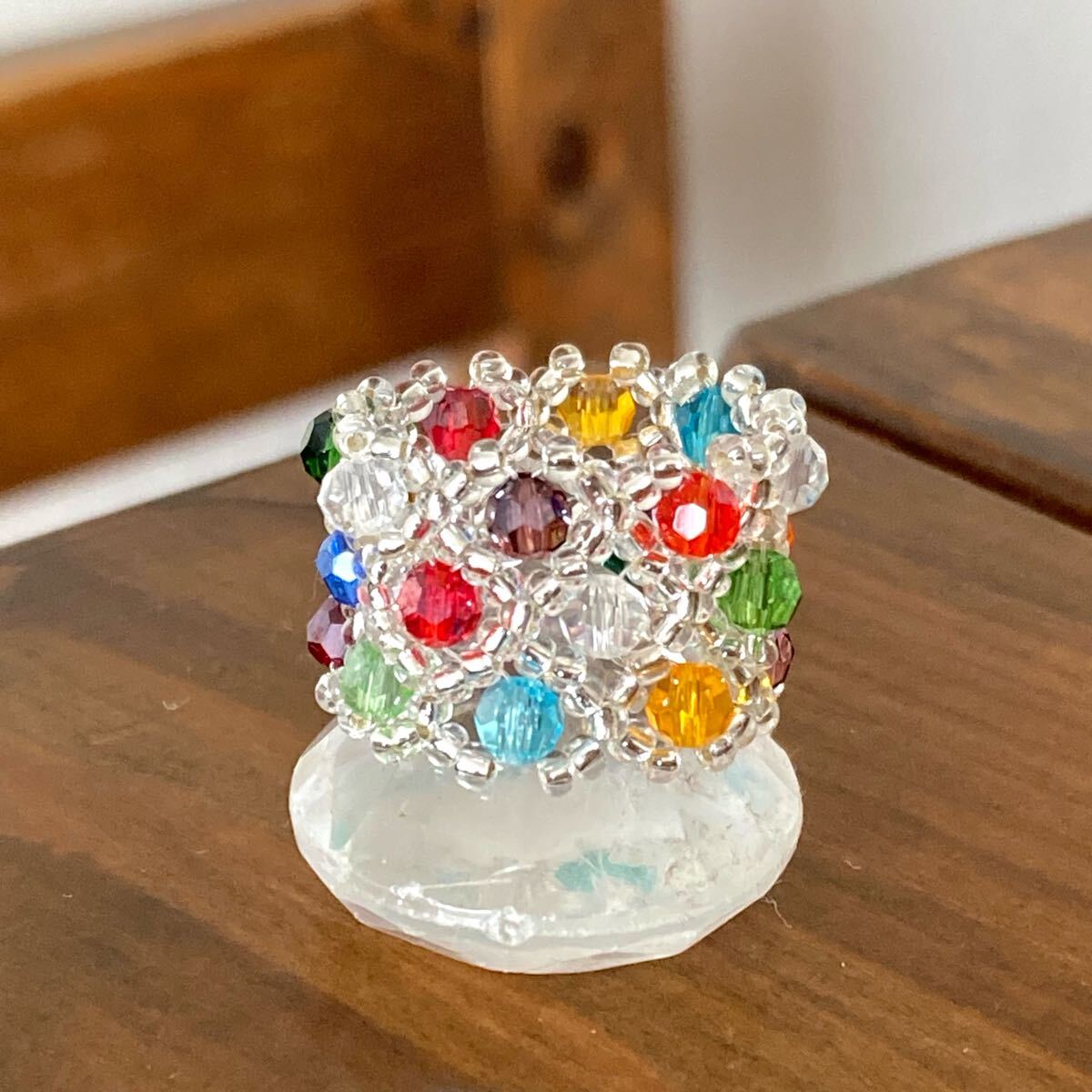 カットガラスビーズのキラキラが可愛いカラフルなアーガイル編みリングです♪