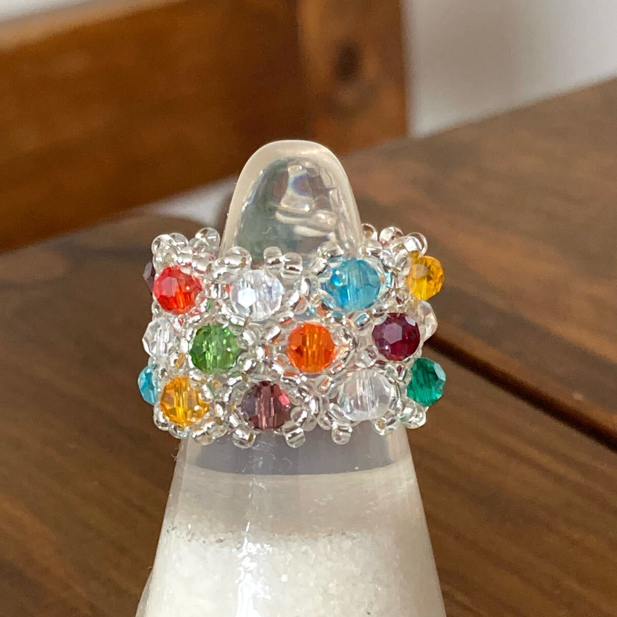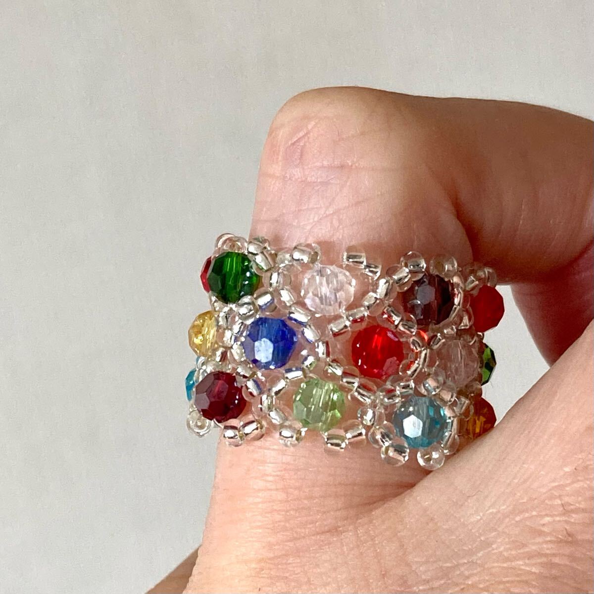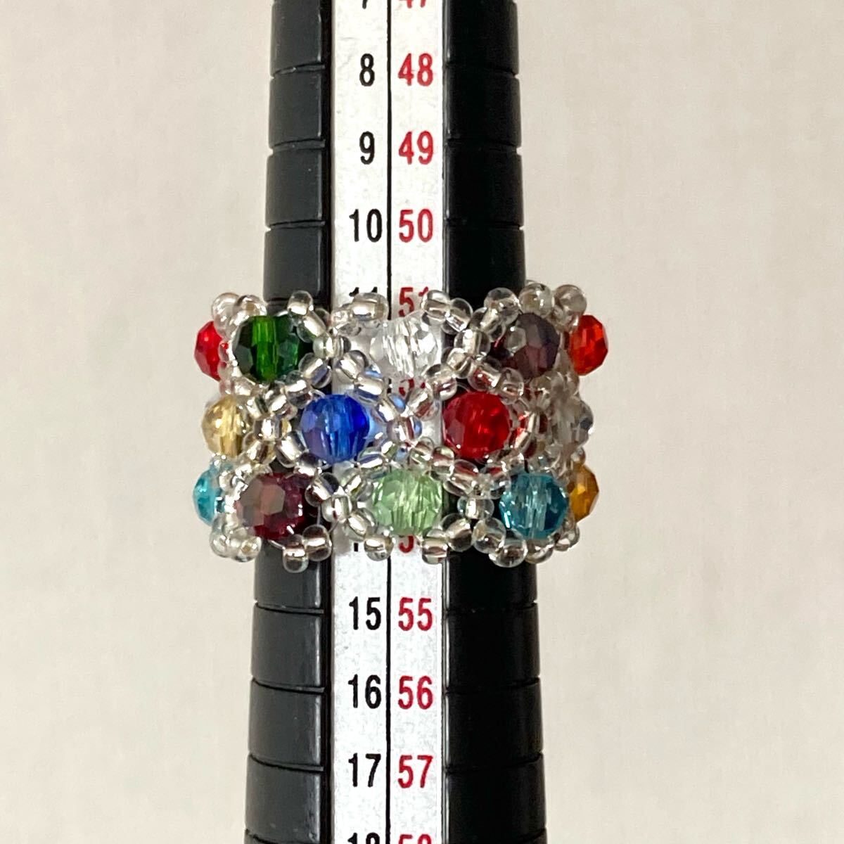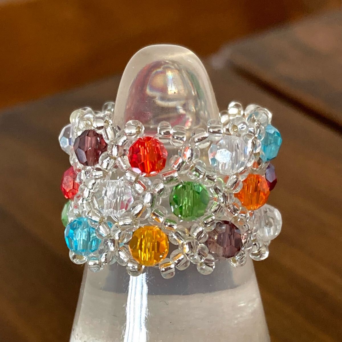 11-13号 ビーズ リング  指輪 ハンドメイド カットガラスビーズのアーガイル編み カラフル×クリアシルバー です。