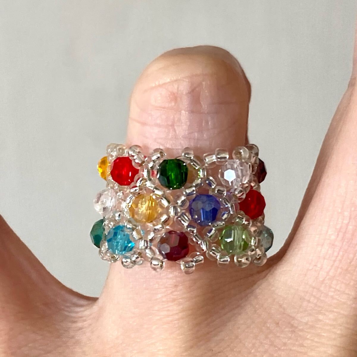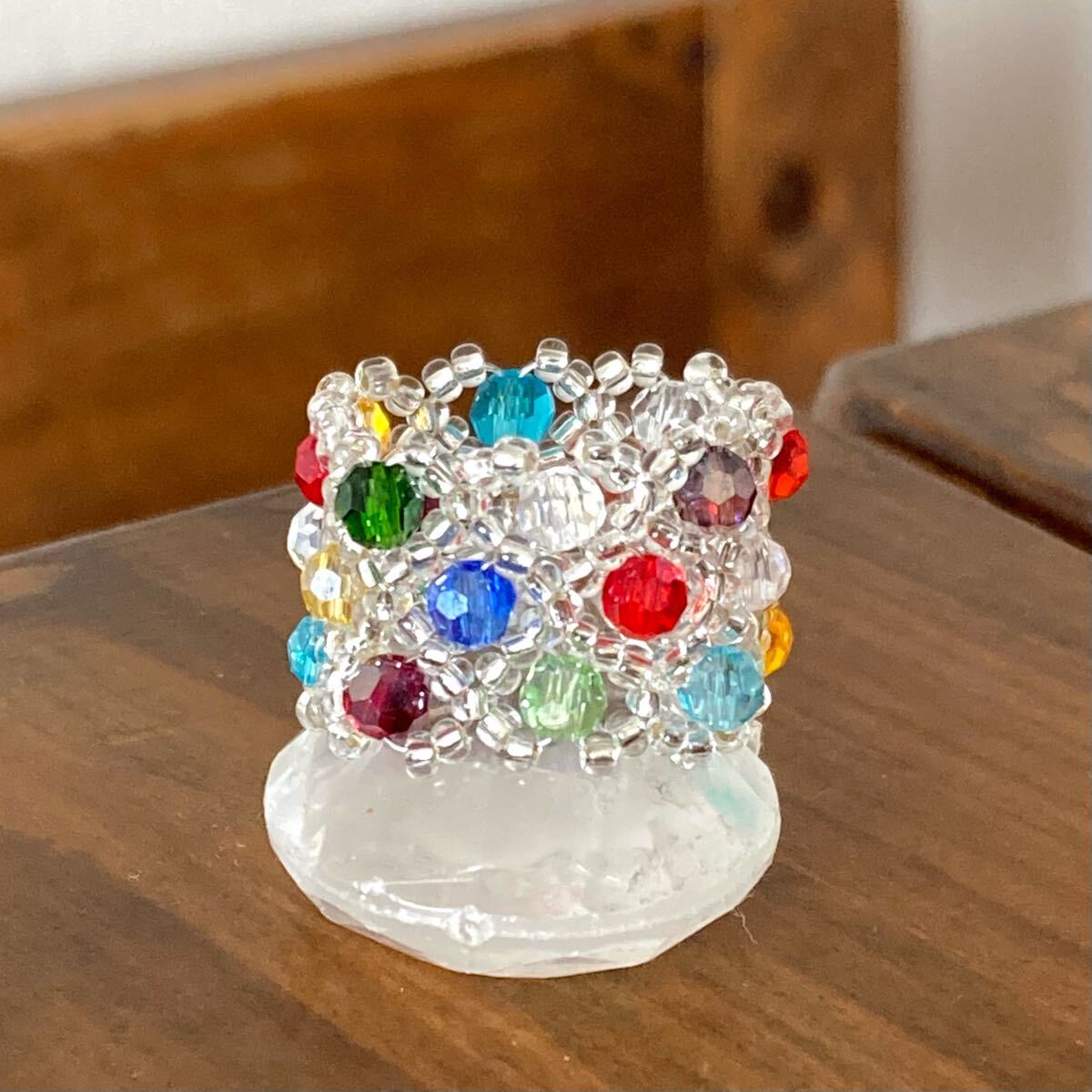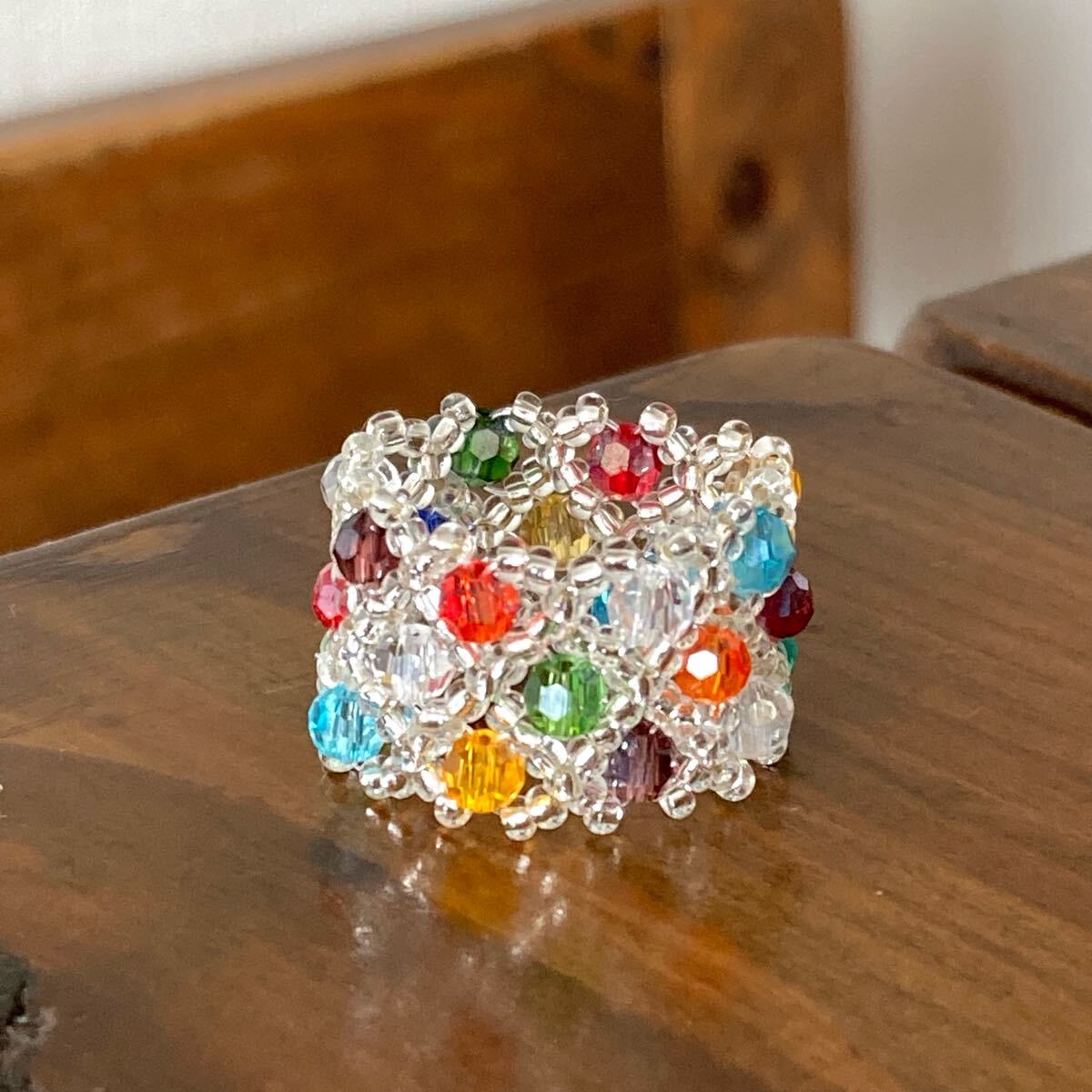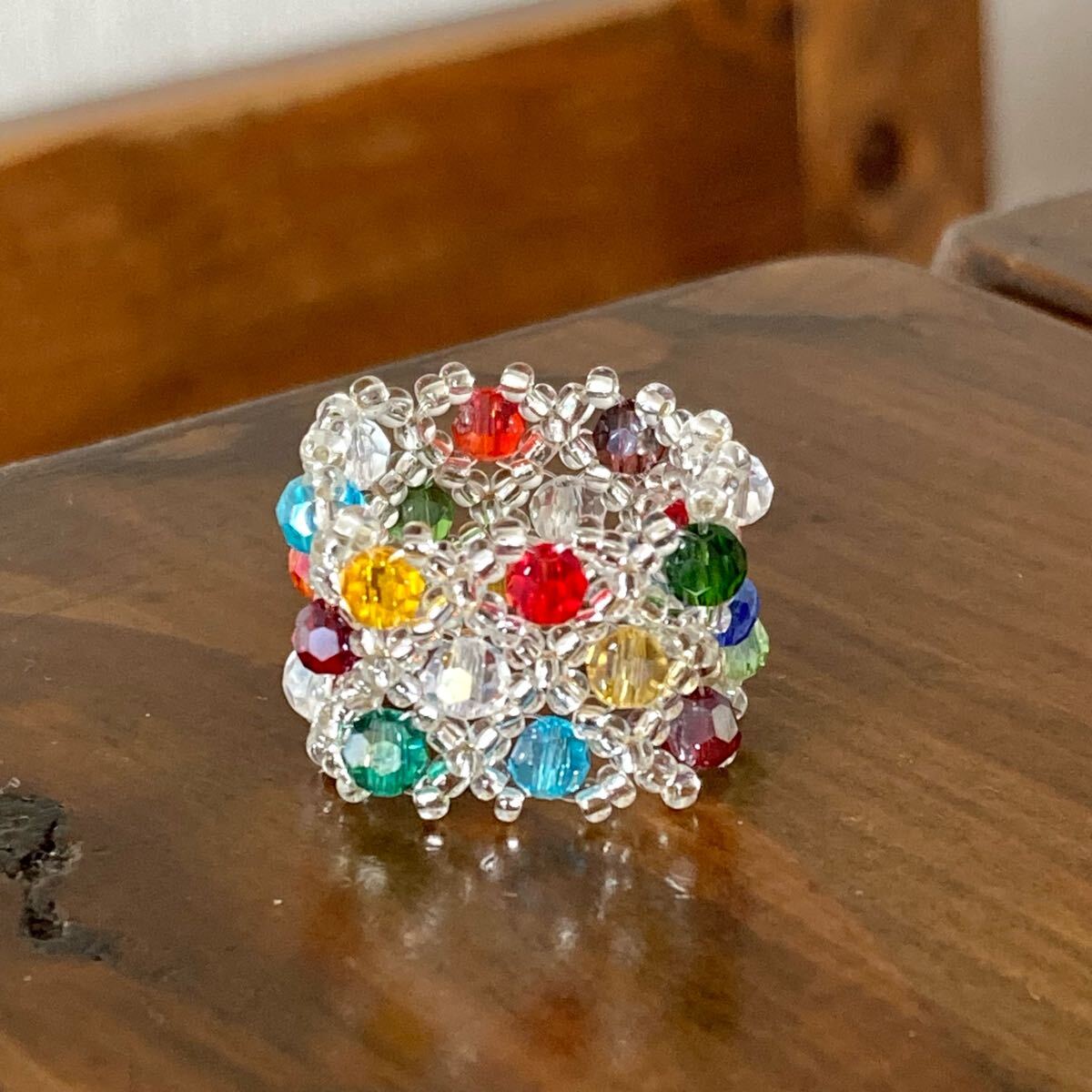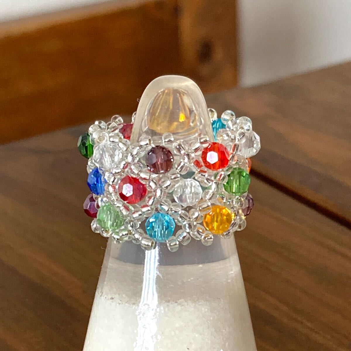 11-13号 ビーズ リング  指輪 ハンドメイド カットガラスビーズのアーガイル編み カラフル×クリアシルバー です。