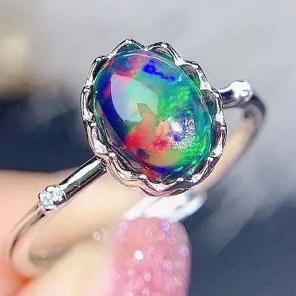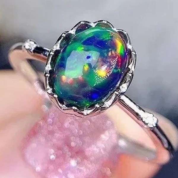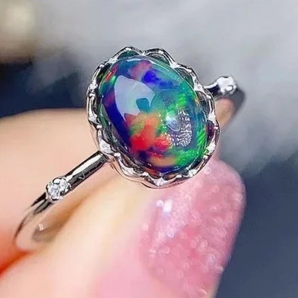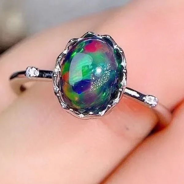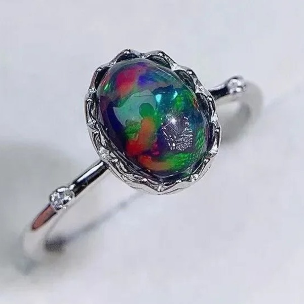 天然オパールリング 、6 * 8mm、ナチュラルカラーオパール、 925 シルバー、日常着用ジュエリー