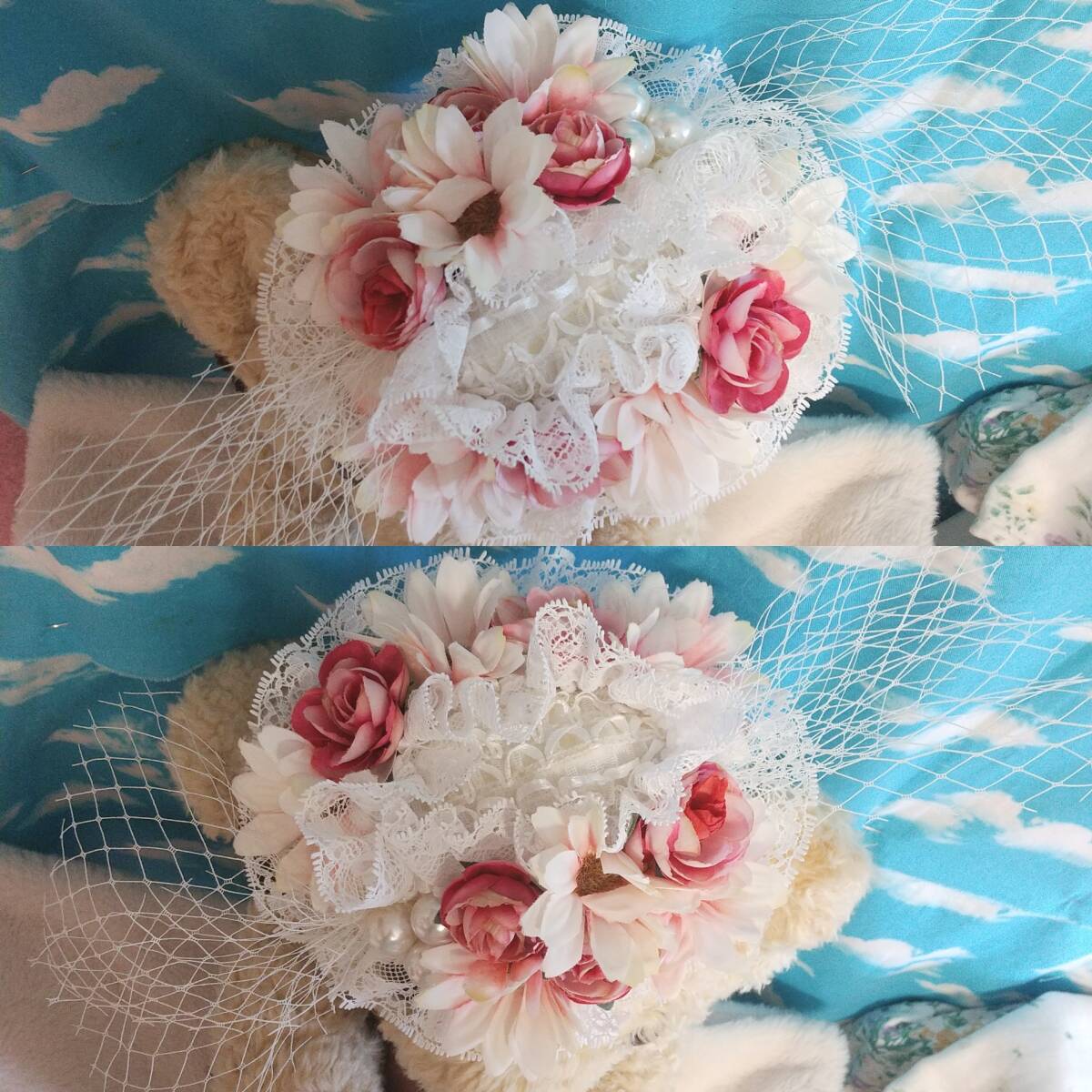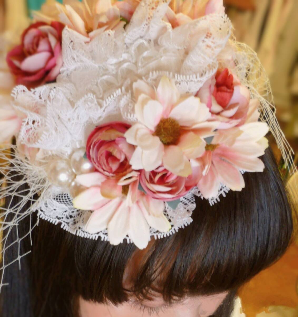 ■DearMyLoveリメイク■お花・レース・パール・ネットの楕円形ヘッドドレス ピンク×白系■薔薇バラ造花フラワーゴシッククラシカルロリータロリィタゴスロリガーリーアンティークドール