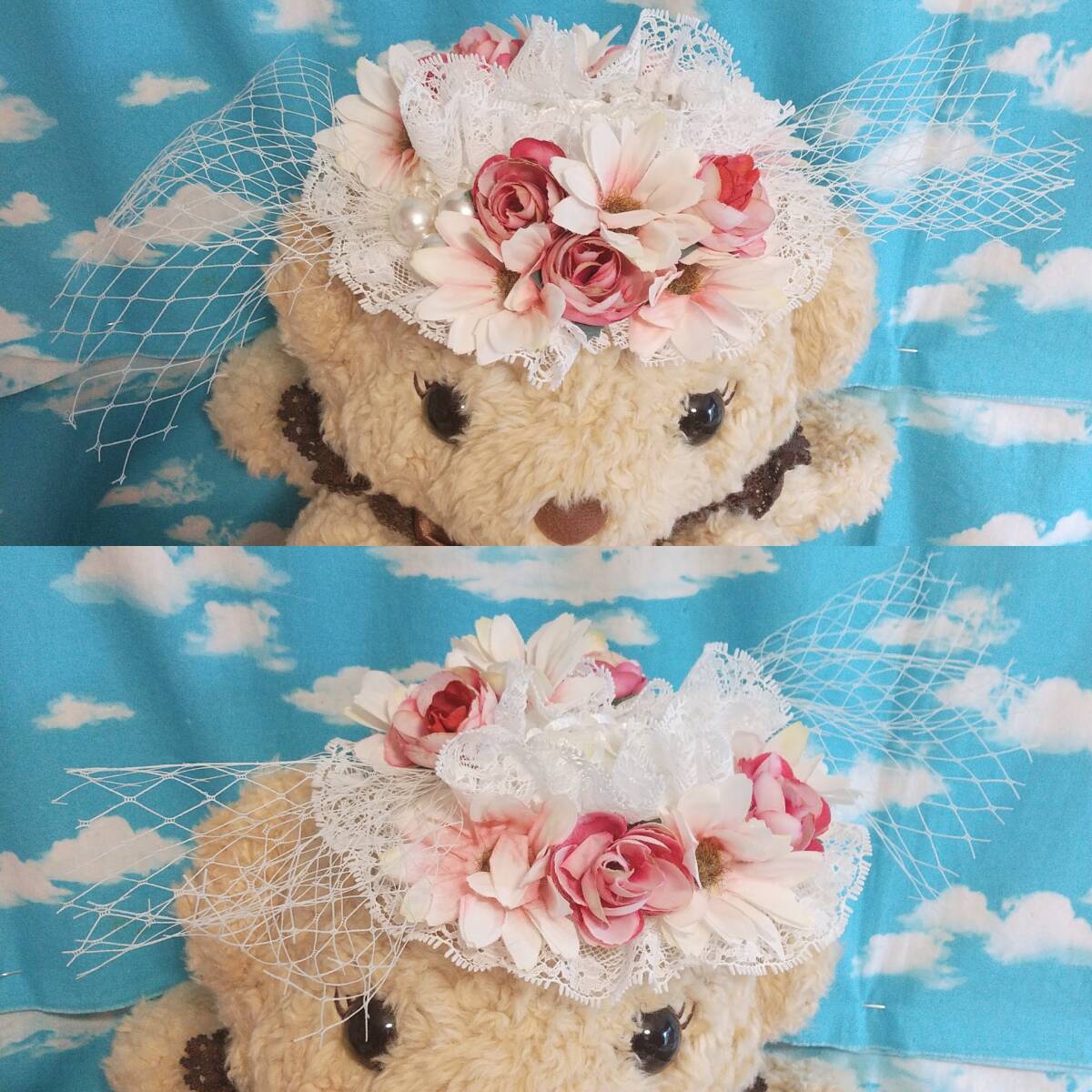 状態についての特記 元々内側に付いていたカチューシャのサイズが小さくきつかった為取り外してリメイクしています(カチューシャは付属しません)。カチューシャを通してあったリボンの輪(縫って補強済み)が2つあるのでそこにヘアピンやヘアクリップを通して固定出来ます。2度着用し、部屋に飾っていました。軽く粘着ローラーをかけています。特に汚れや破損などはなく状態は普通です。