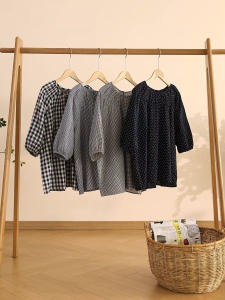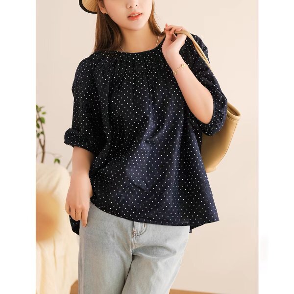 c 0705 高質 チュニック ワイシャツ トップス ドット柄 フリーサイズ ナチュラル 通気性手触り抜群 綿100% ネイビー