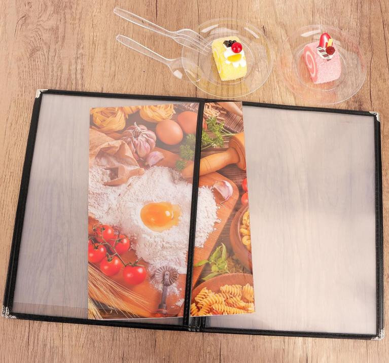 飲食店などで使用されるメニューブックです。両面印刷の中紙を入れると両方から見れます。