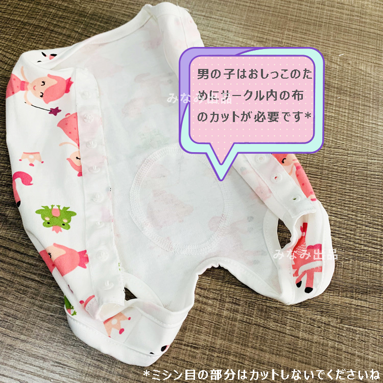◇男の子は着用したまま、うんちはできますが、おしっこをするためには、おむつを着用するか、下腹部の丸いミシン目の「内側」を切る必要があります。