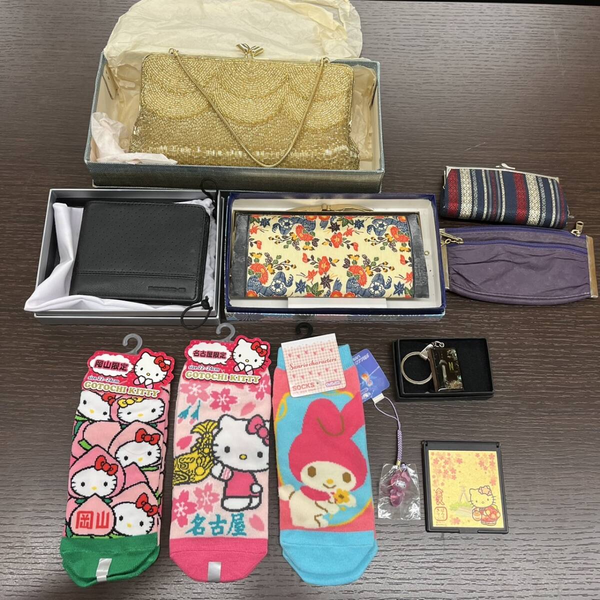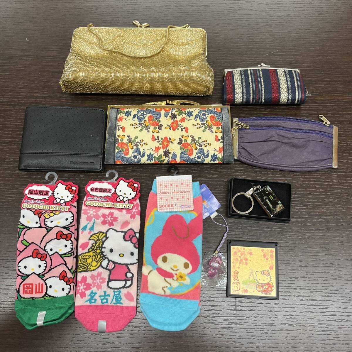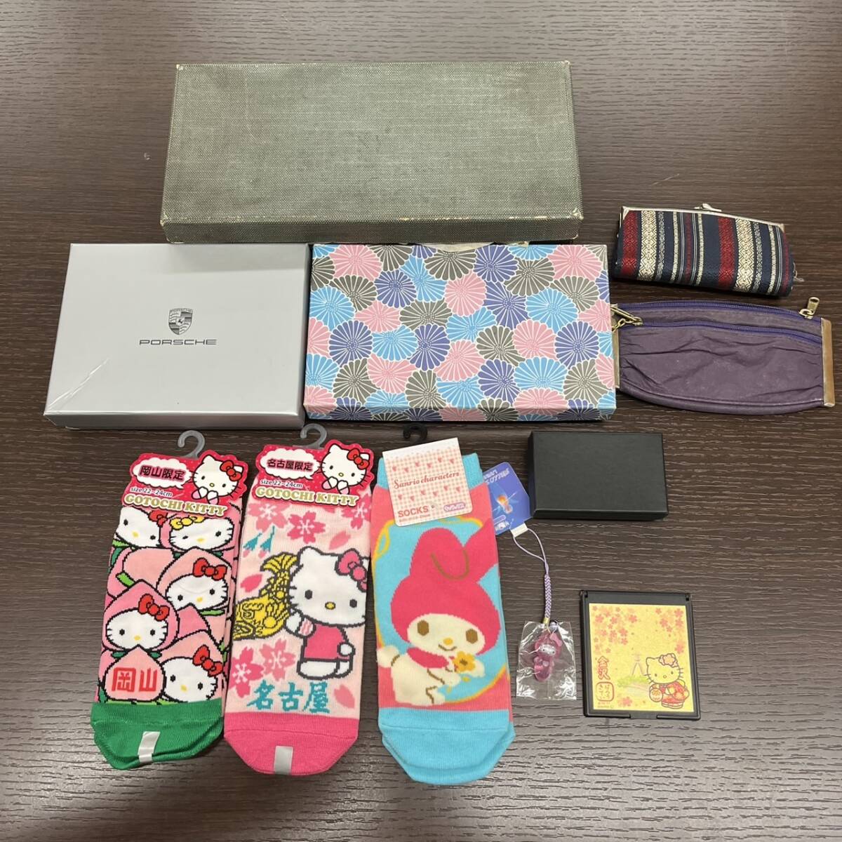 | #12348A 雑貨11点まとめ 【ハローキティ ストラップ・名古屋限定&岡山限定ソックス,ポルシェ財布,ソウルタワー キーホルダー 他】 日用品 | ||